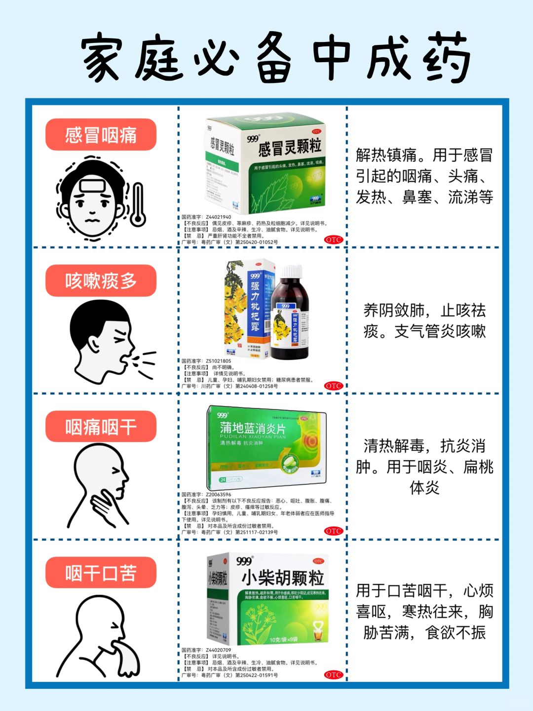 999感冒灵颗粒、强力枇杷露、小柴胡颗粒、蒲地蓝消炎片,这四款中成药是阿九家常备的(图3️⃣):