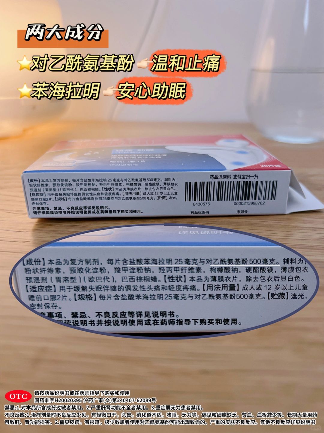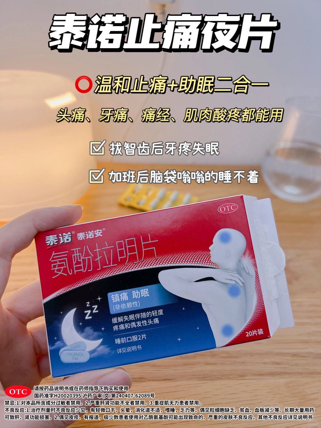 因为晚上总被痛醒,所以挑止痛药的时候,我选择更适合夜间服用的。我家里是常备泰诺止痛夜片,因为它里面不仅含有止痛成分对乙酰氨基酚,还添加了助眠成分苯海拉明,可以达到止痛+助眠二合一的功效,特别适合夜间头痛睡不着的人群,睡前吃两粒,沾床就睡,一晚上都睡得特别香,不会出现疼醒的状态,关键都是非依赖性成分。