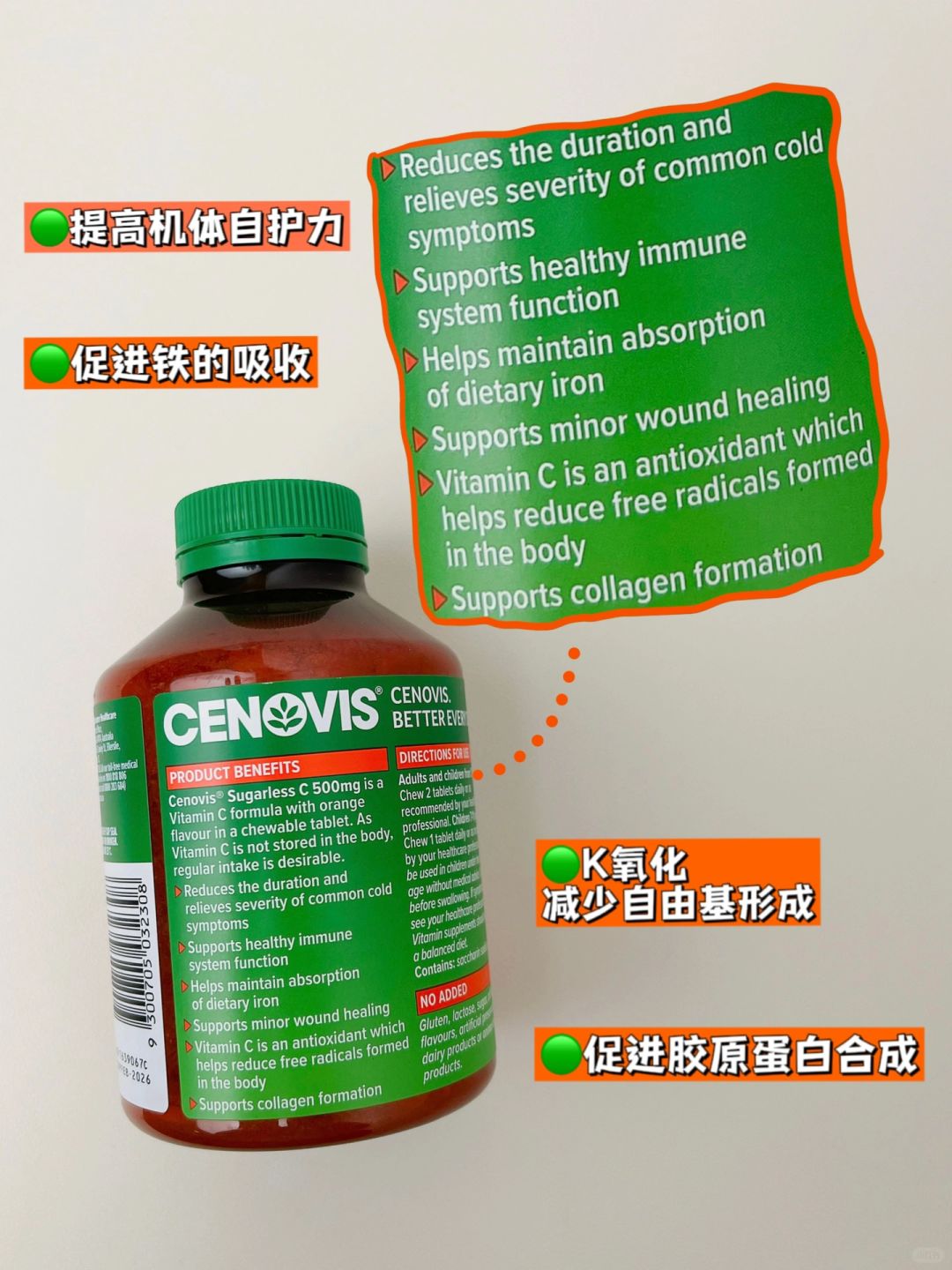 ✅✅Cenovis维生素C 每片含500mgVC,一天两片,满足日常所需!而且无糖无添加,香橙味很可口。一瓶有300粒,花小钱办大事,一点不含糊!