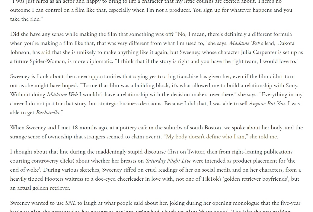 「悉尼妹」Sydney Sweeney 参演的索尼影业蜘蛛侠衍生电影《蜘蛛夫人》口碑票房双扑街,在最新的《GQ》杂志专访中,悉尼妹表示她并不为此感到遗憾。