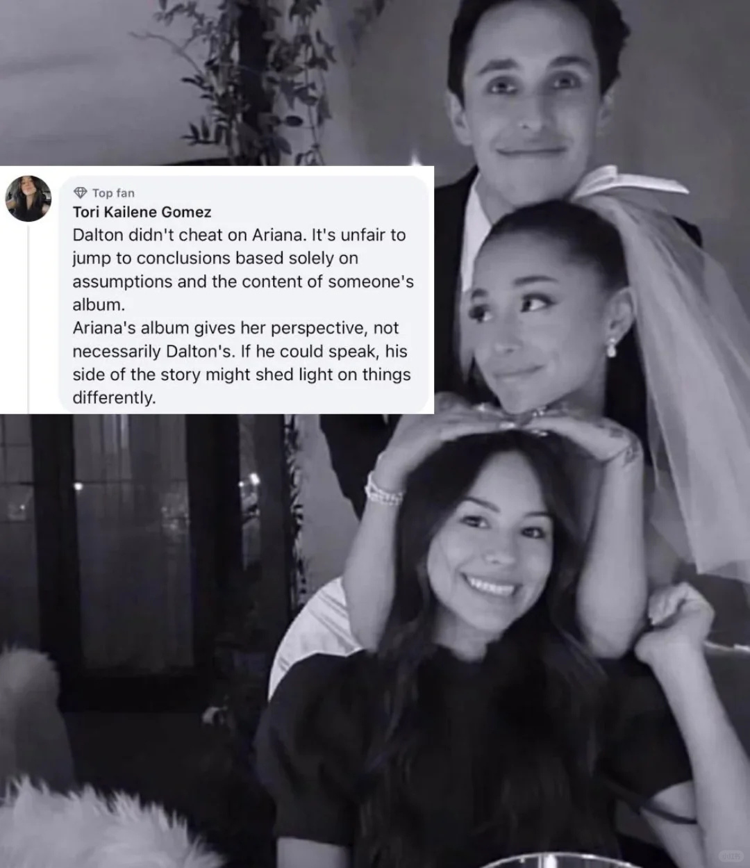 Dalton Gomez的妹妹Tori在TMZ的帖子下留言澄清她的哥哥没有出轨【图3】,并表示:网友只因为A妹专辑里所说的一些内容就指控她哥哥出轨,这很不公平。A妹专辑里所说的内容只能代表她的视角,如果她的哥哥能站出来说出他的故事,事情可能会大相径庭。