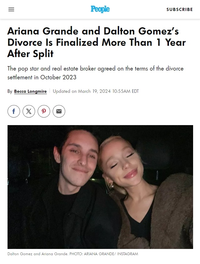 经过一年时间,Ariana Grande和房产经理前夫Dalton Gomez正式离婚。