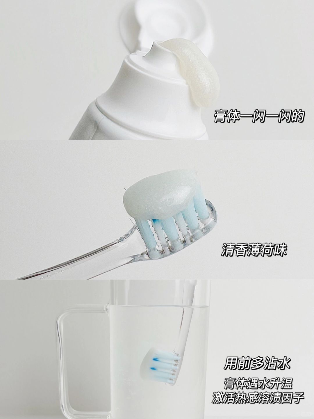 它核心成分是六偏磷酸钠,能够高效溶渍,被称为牙膏界的“烟酰胺”,它的膏体是低水配方,所以使用的时候先湿润口腔,刷牙前牙膏先沾水来激活热感溶渍粒子,刷的时候会有温温热热的感觉。