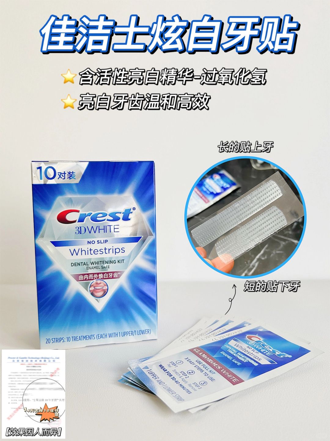 佳洁士炫白牙贴的美白成分是过氧化氢,能温和高效亮白牙齿,用起来延展性好,不酸牙不刺激,像我牙齿不齐也能用,和牙膏一起用是绝配。