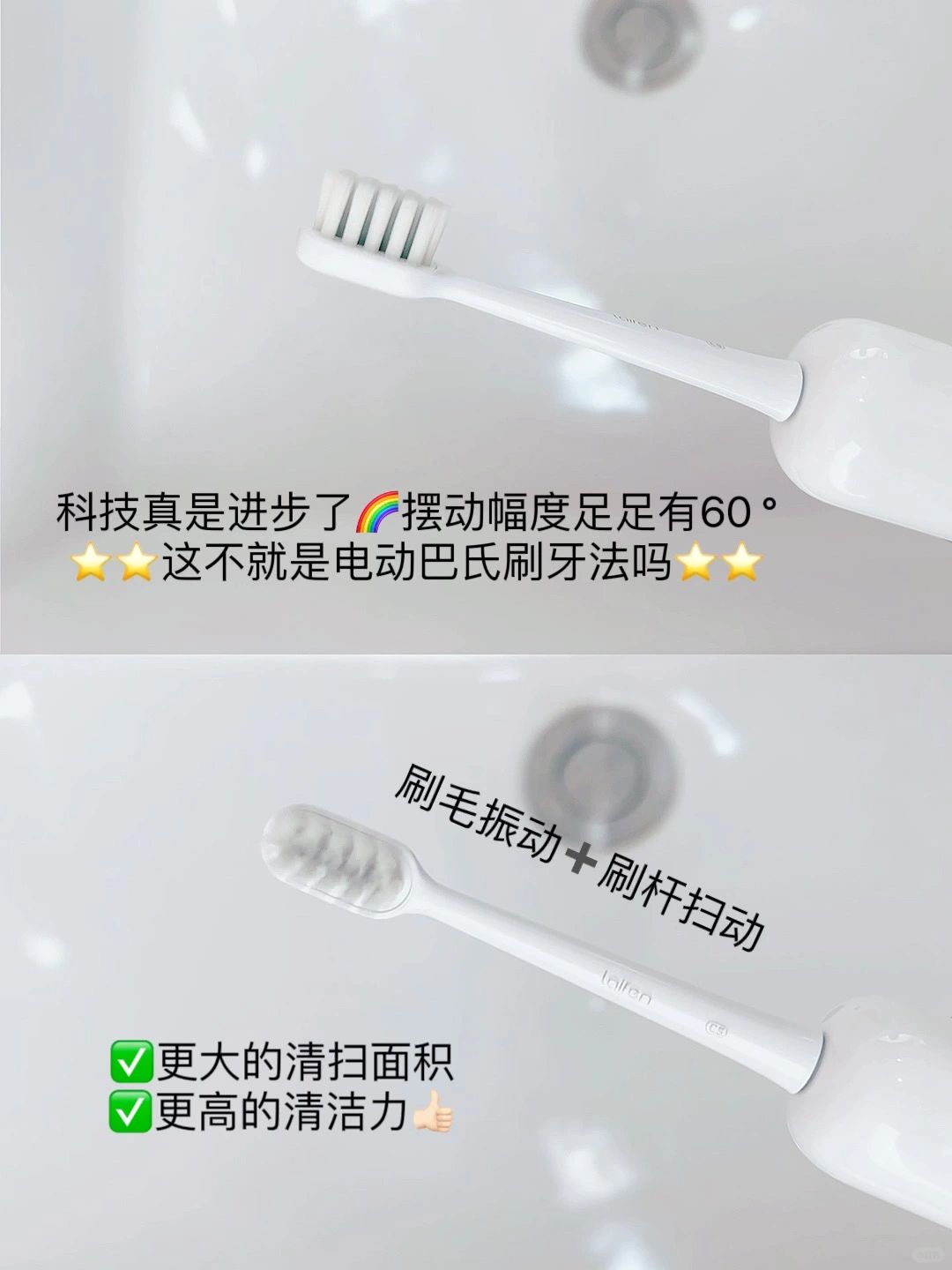 大幅度的拂扫带来更好的清洁,清洁效果已经非常接近巴氏刷牙法啦!