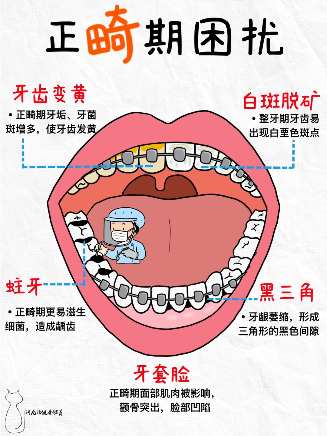 因为佩戴牙套关系,会大大提升口腔清洁难度,造成食物残渣残留在口腔里,加上细菌的影响,逐渐形成了牙垢、牙结石、龋齿、脱矿等恼人的口腔问题。