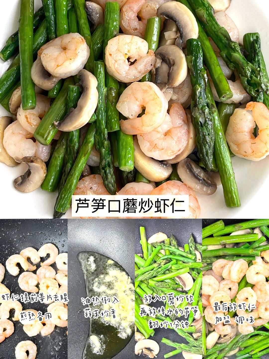 3️⃣芦笋口蘑虾仁:芦笋焯水备用。虾仁用姜片去腥,煎熟备用。油热炒香蒜末,放入口蘑炒软再放入芦笋翻炒1分钟,倒入虾仁,加盐调味即可。