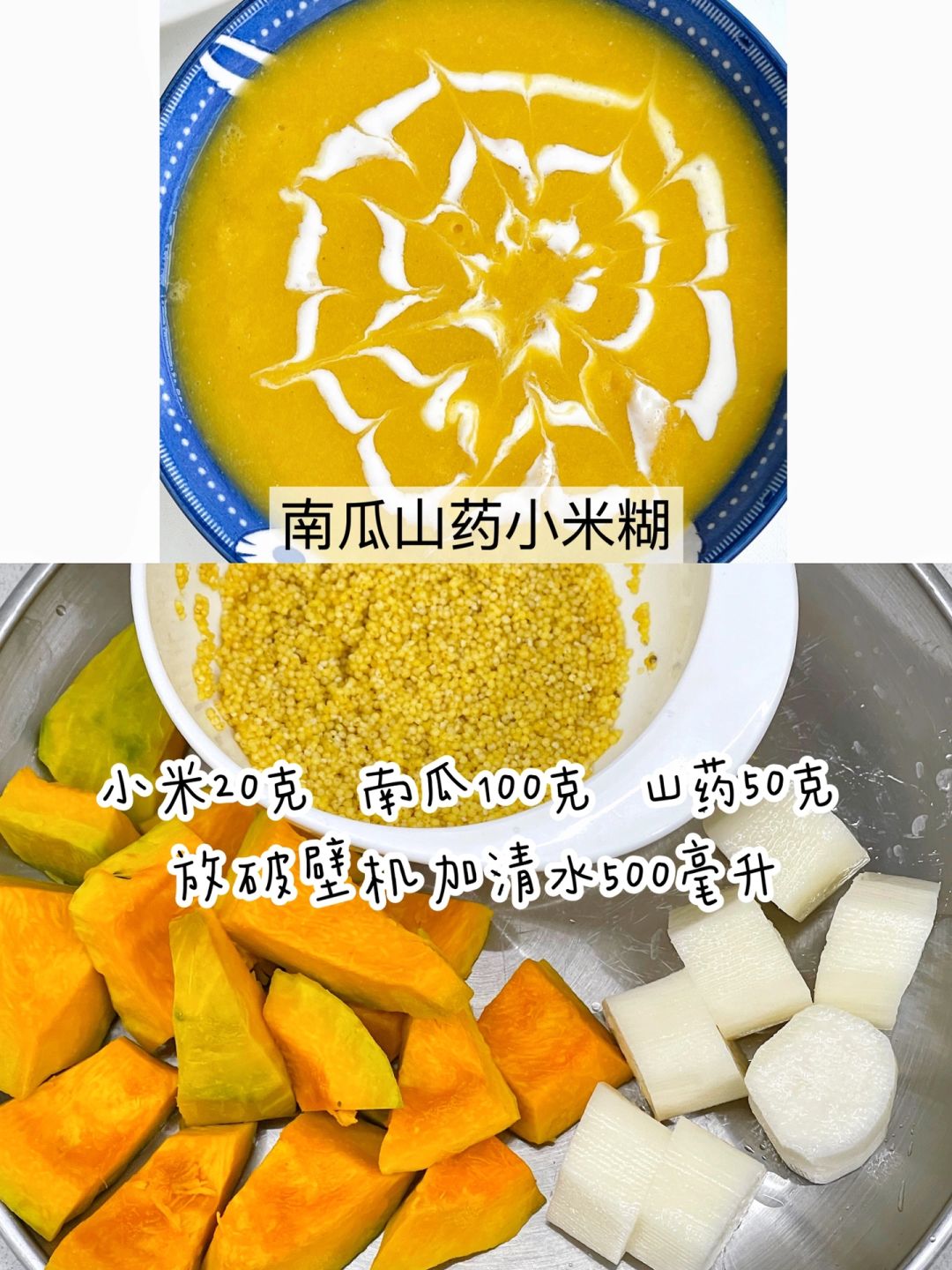 4️⃣南瓜山药米糊:小米20克、南瓜100克、山药50克、清水500毫升,破壁机米糊模式。