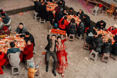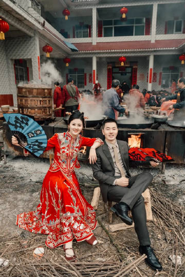 为什么女的穿中式男的穿西服啊?不考虑搭一下吗?