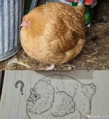 美术课要孩子画一只鸡,有个小孩画了左图没及格,回家爸爸把画和奶奶家的老母鸡放一起拍张照发给老师。