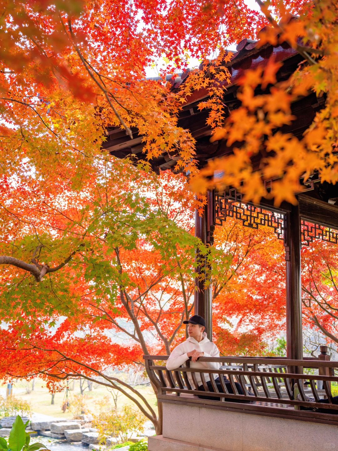 红枫已经是鲜艳的火红色,坐在亭台中感受满眼红枫,觉得红枫和古建筑的搭配真的太美了~