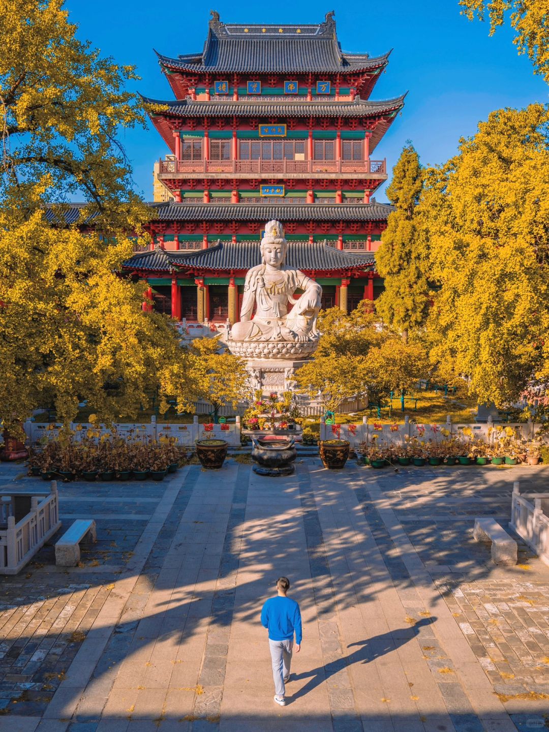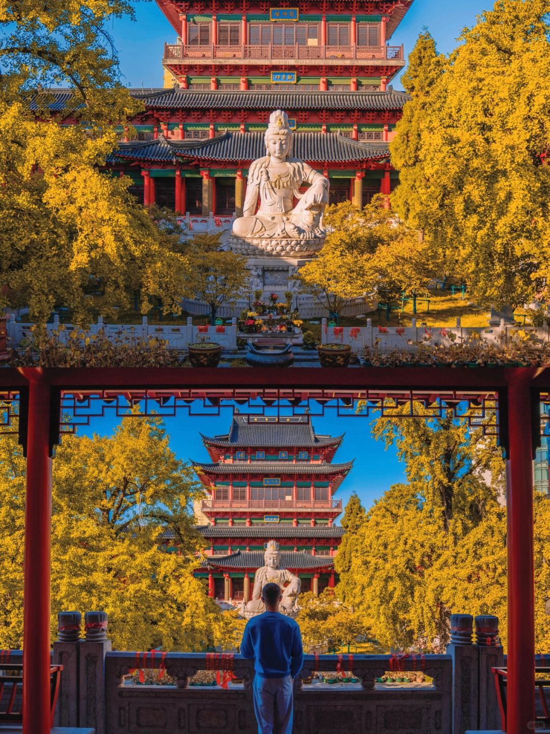 藏在闹市区的一处古寺,佛像和两颗百年银杏是必拍点之—,银杏叶与古建筑搭配,怎么拍都能出片~