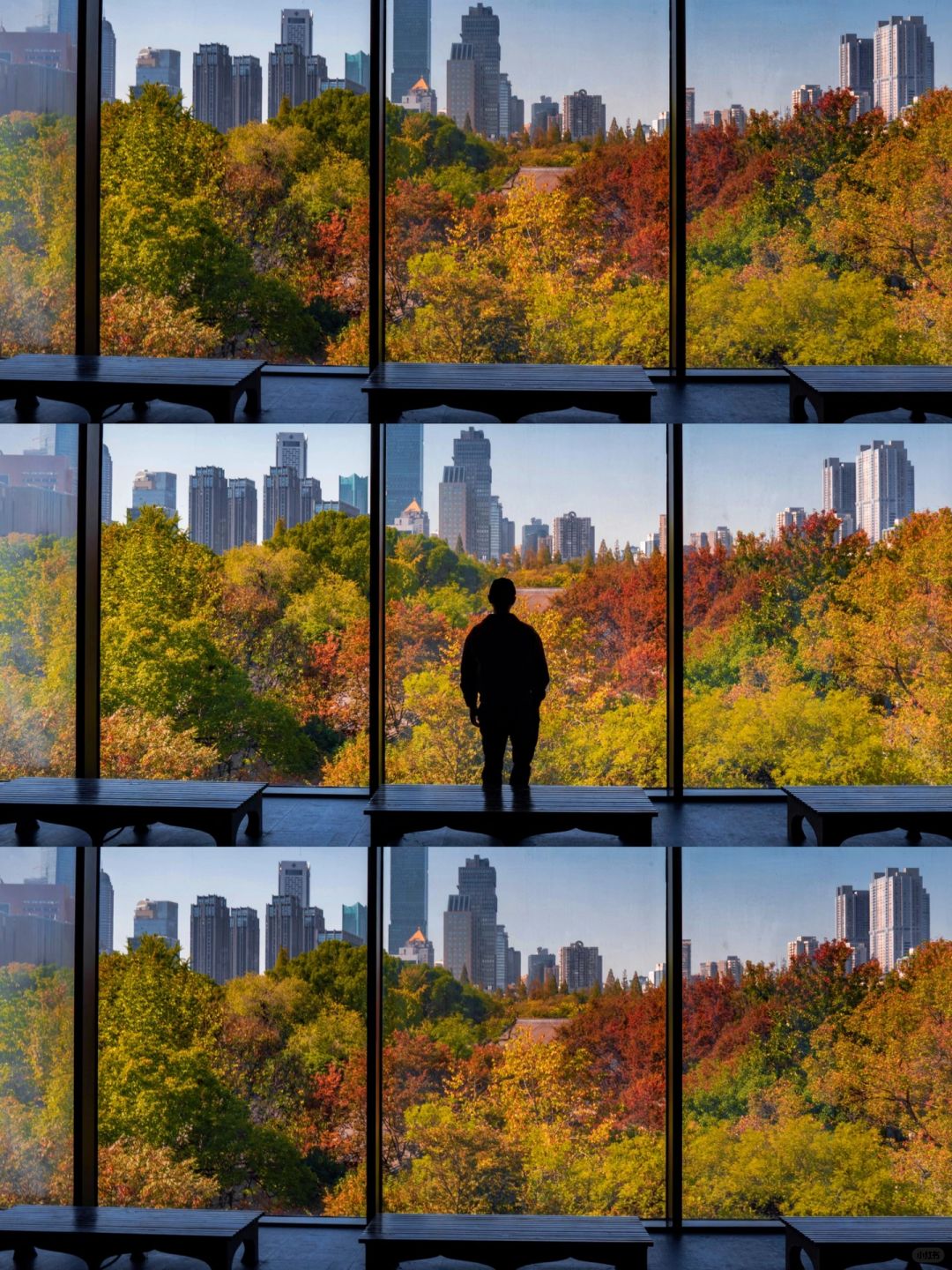 被这扇落地窗外的秋色吸引住了~静静地坐着欣赏满城层林尽染,如同一幅秋林长卷图,尽收眼底~