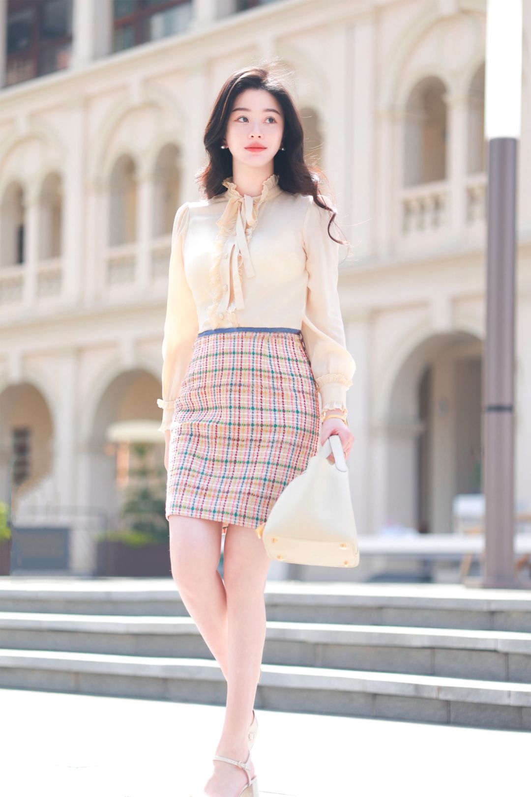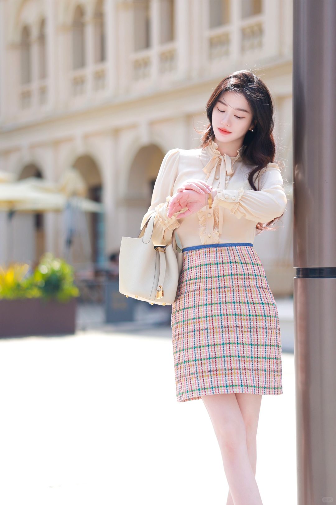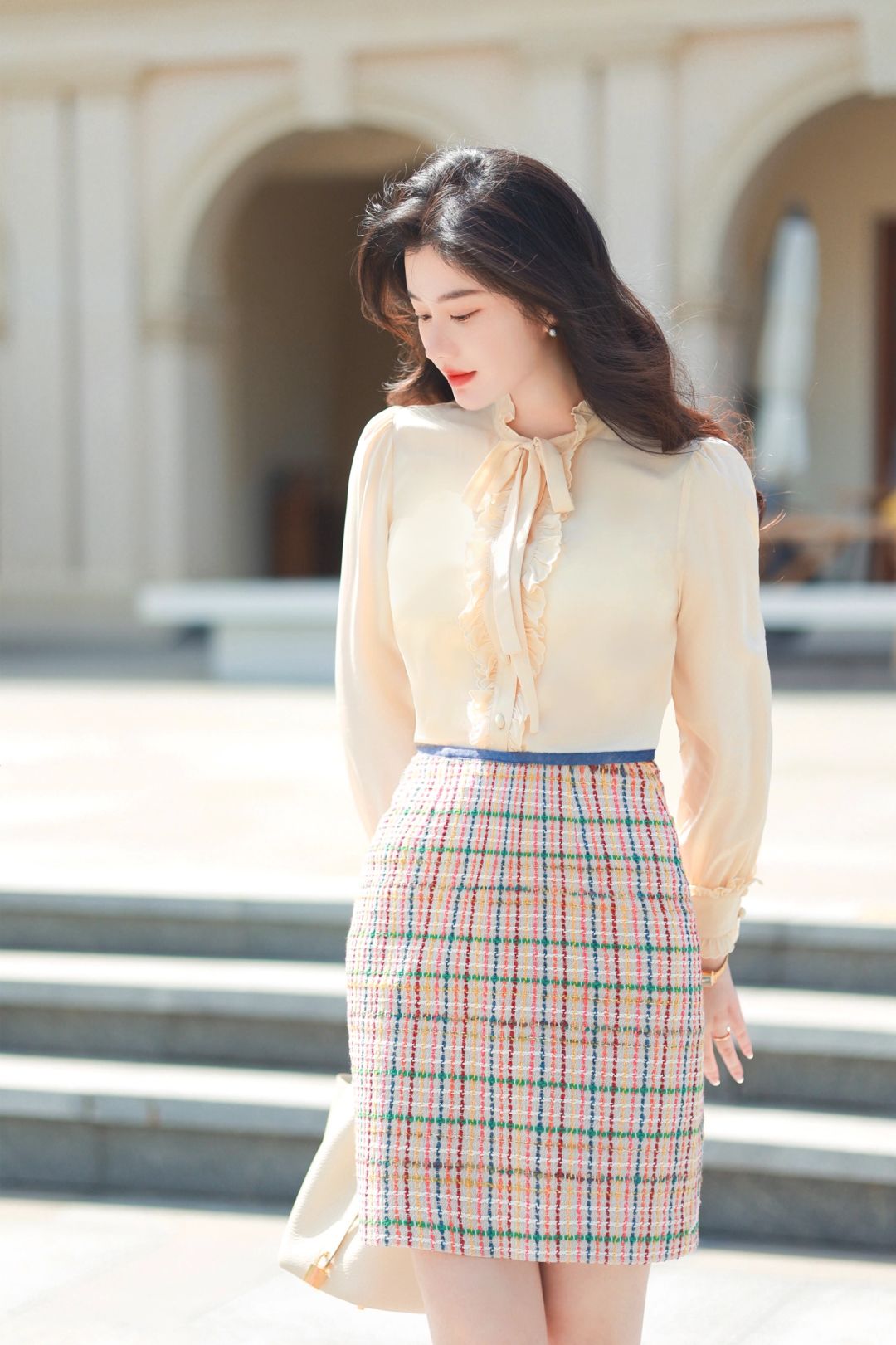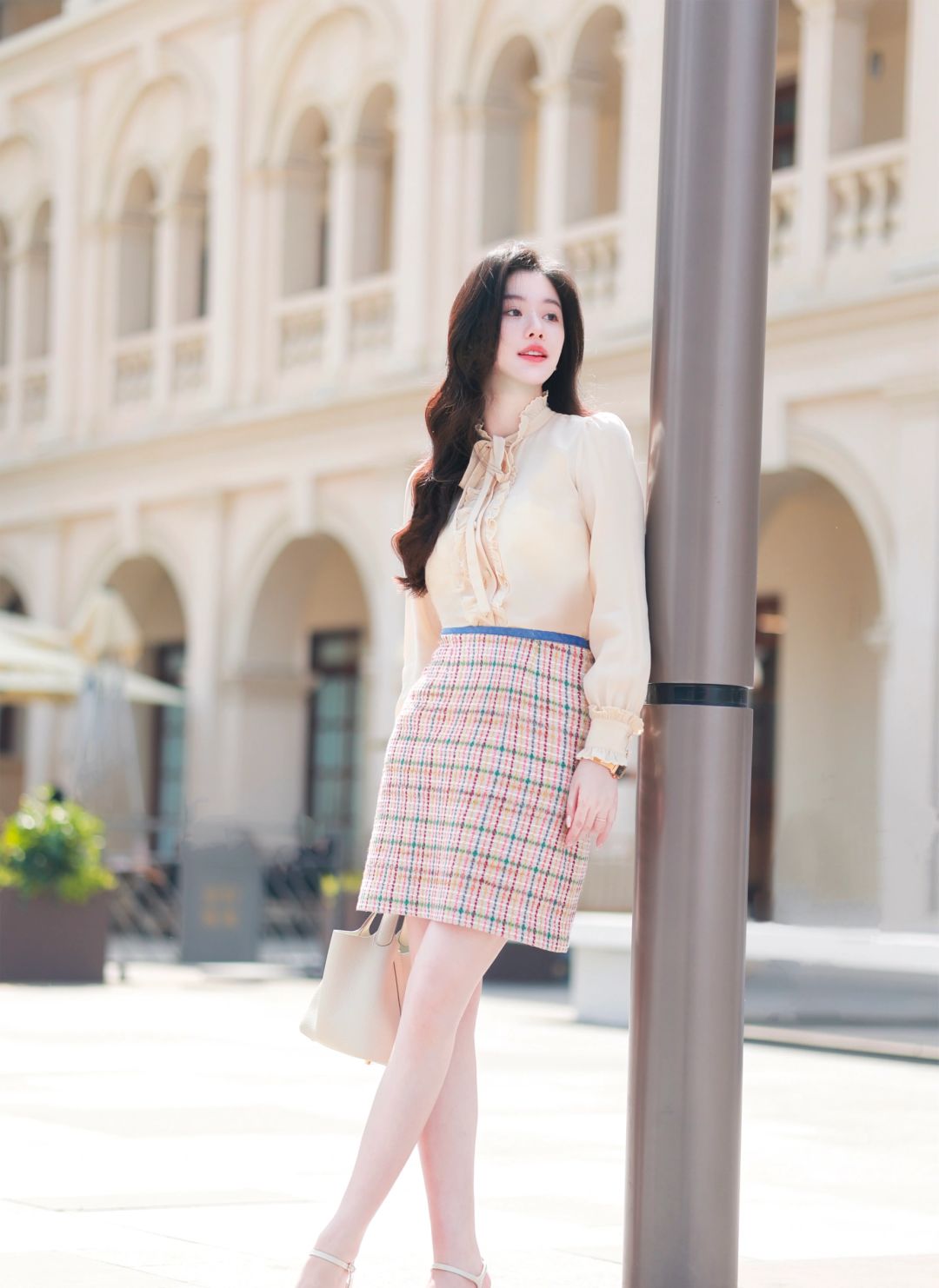 搭配一件红、绿、黄与粉色丝线交织的英伦格纹半裙,可以穿着它出入公司,也可以穿去南法晒太阳⛱️
