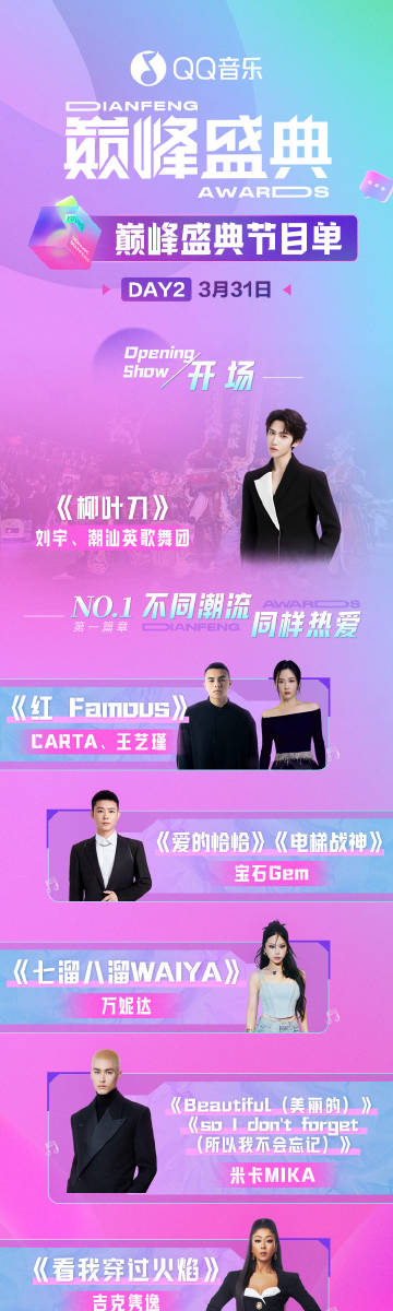 QQ音乐巅峰盛典节目单 3.30日:黄子弘凡周震南袁一琦王琳凯张碧晨王