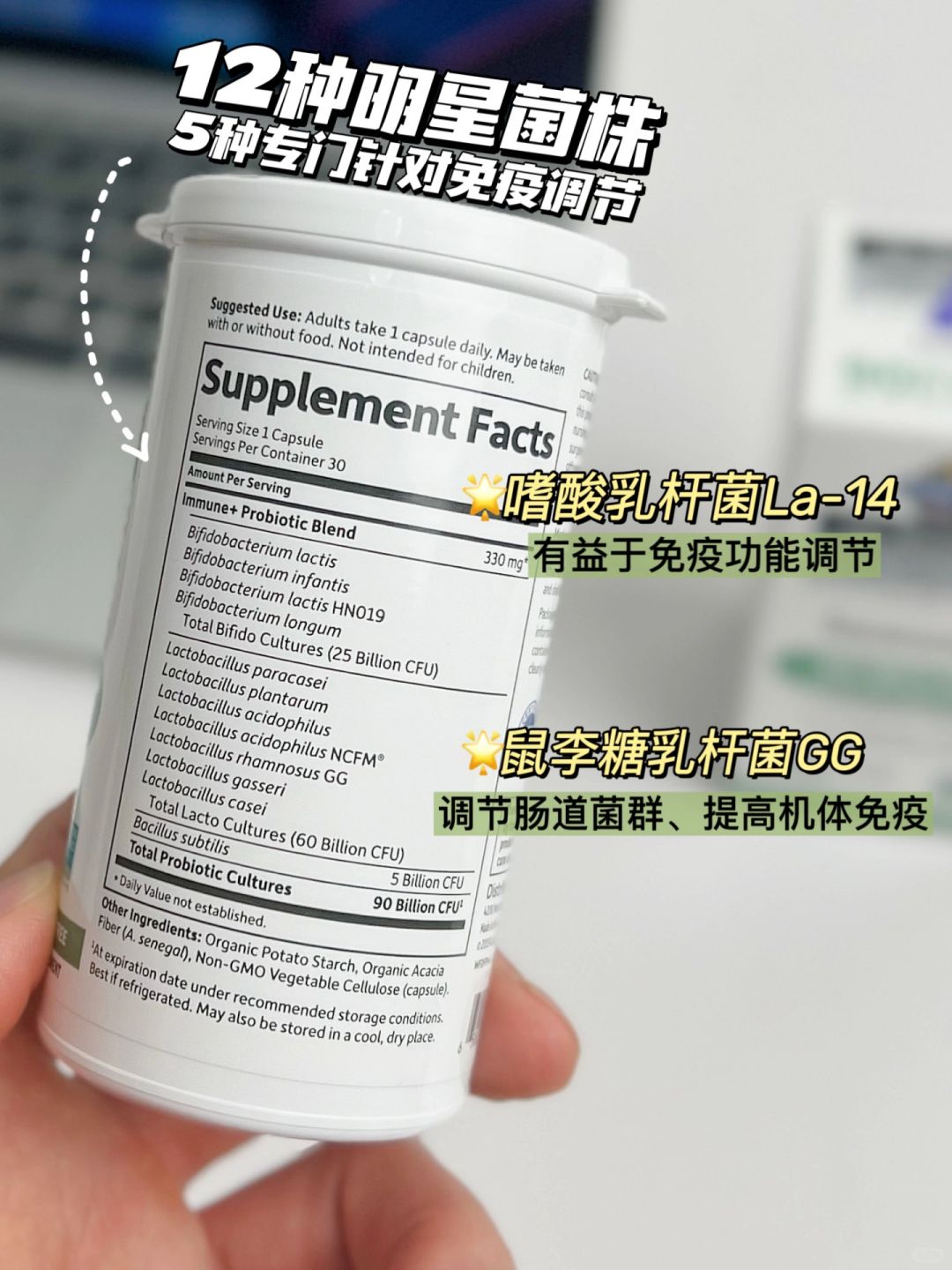 每一粒胶囊含有900亿活性益生菌,多达12种优质明星菌株,其中还有5种专门针对免疫调节,特别是嗜酸乳杆菌La-14和鼠李糖乳杆菌GG这两个菌株,可以帮我们调节好肠道菌群、维持肠道平衡,提升自然抵抗力,每天温水吃一粒就行。