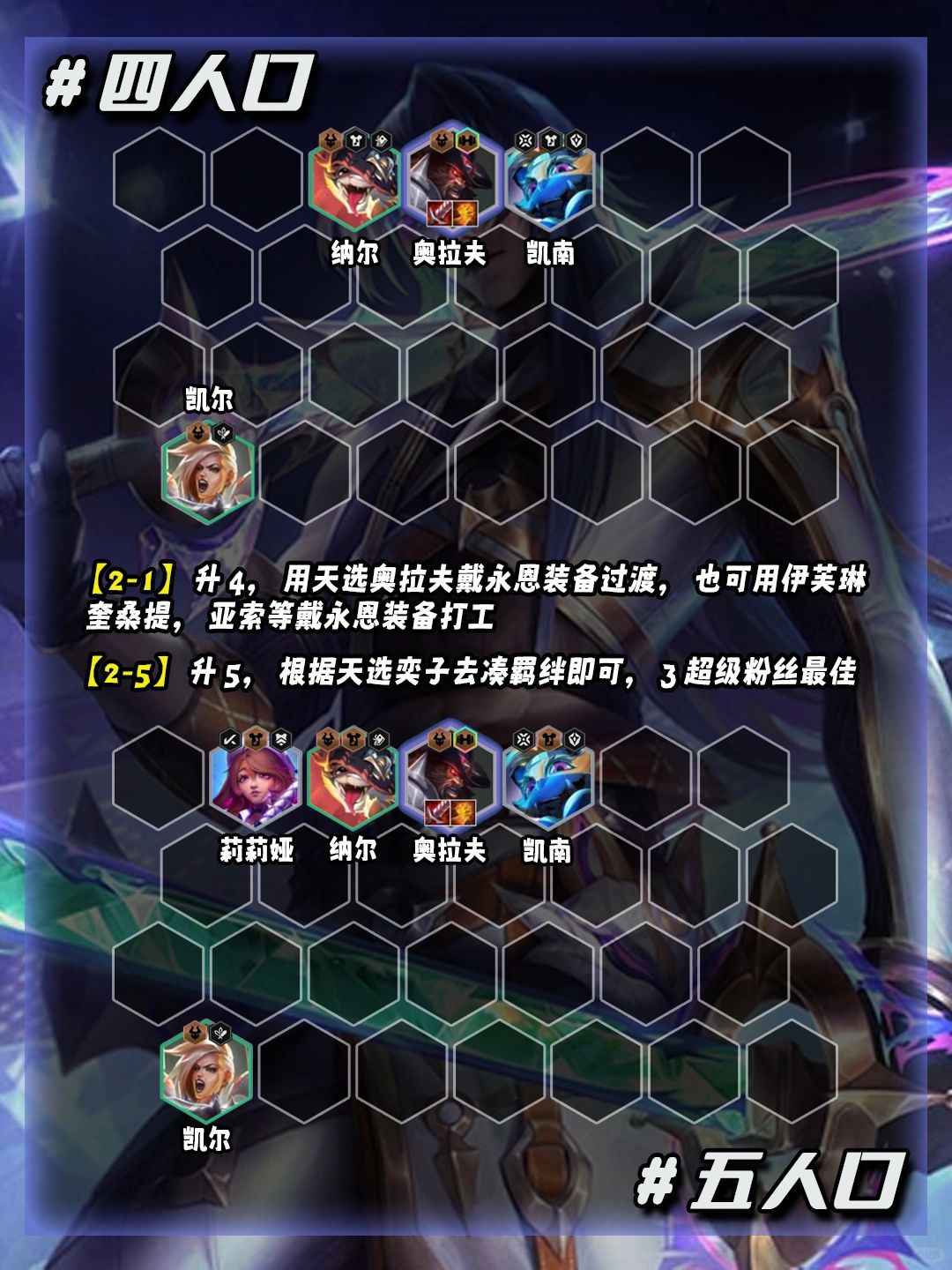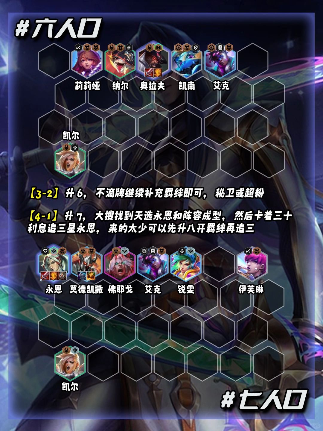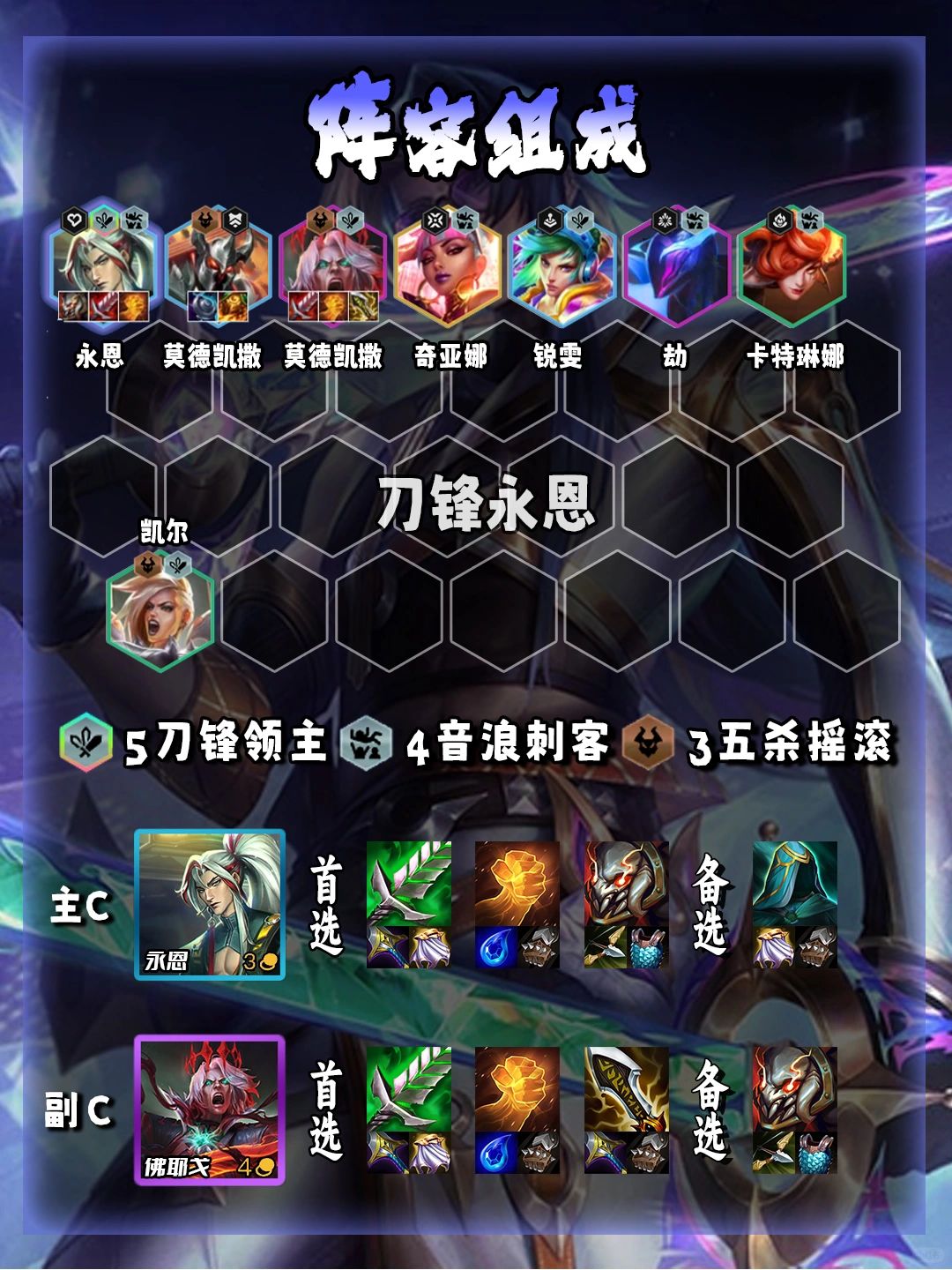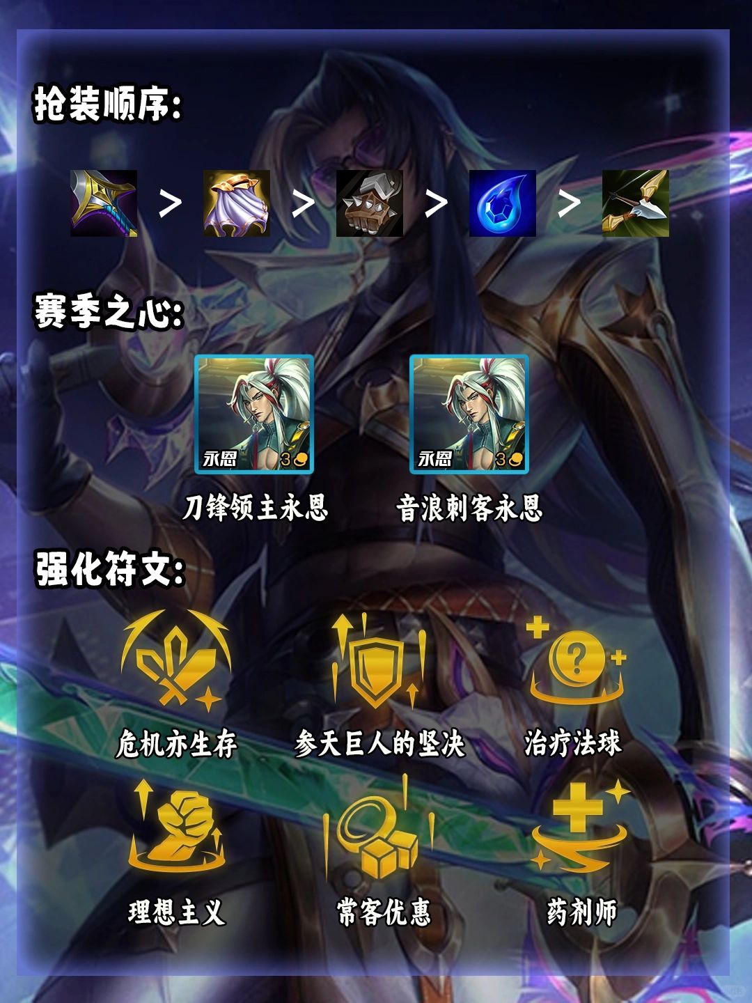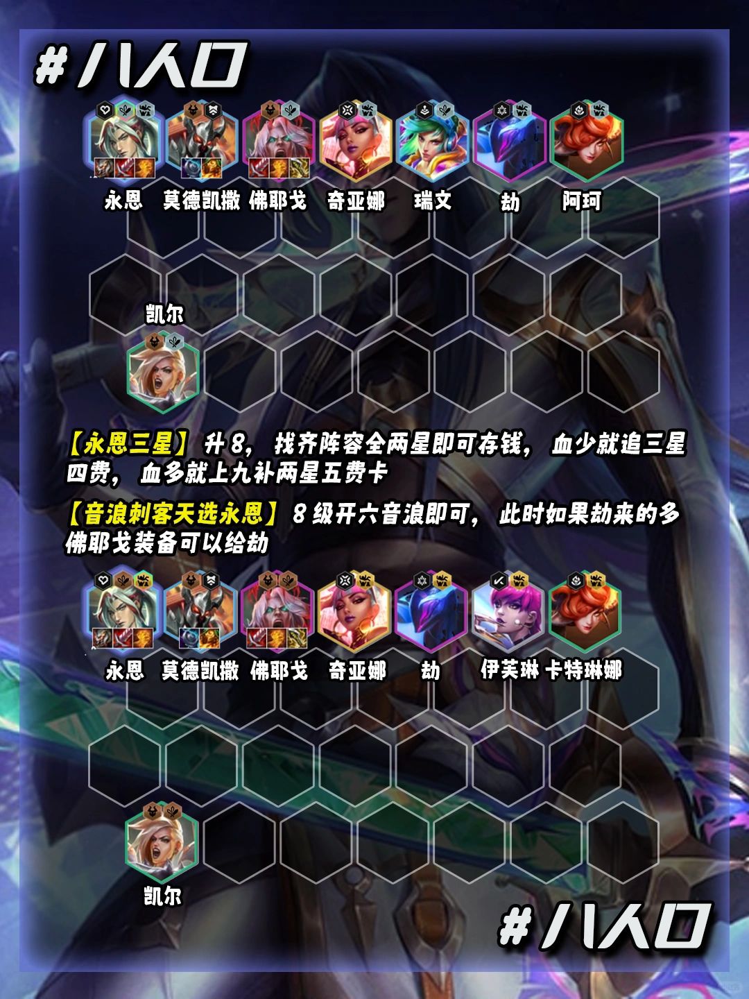 🍖今天版本更新永恩巨大加强! 🍗并且还优化了永恩跳后排的能力! ✨运营思路✨ 【2-1】升4级,前期用天选奥拉夫带永恩装备过度 【2-5】升5级,根据天选补充羁绊即可 【3-2】升6级,不滴牌继续补充羁绊 【4-1】升7级,大搜找到天选永恩和全员两星,然后卡着三十利息追三星永恩! 【永恩三星】升8级,补上四音浪刺客阵容即大成 ✨装备思路✨ 【优先装备】吸血剑 正义 泰坦 【前排装备】给莫德凯撒,薄暮 日炎最优 【物理装备】给佛耶戈,吸血剑 正义最优