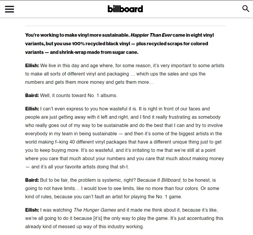 Billie Eilish 接受《Billboard》采访聊环保问题,谈到现在许多歌手「一张专辑发行多个版本黑胶」的现象时,碧莉批评这些歌手非常不注重环保、并且指责他们只知道赚钱、销量和成绩。
