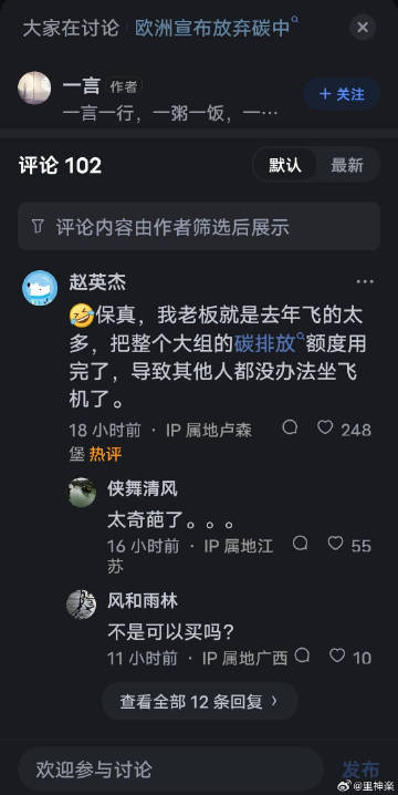 好家伙,不能坐飞机,能坐火车。火车难道就没有碳排放吗?还有平时开车,用电,西方是怎么做的?