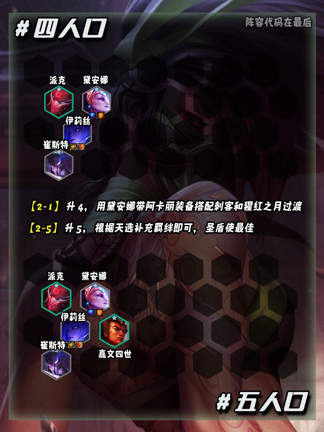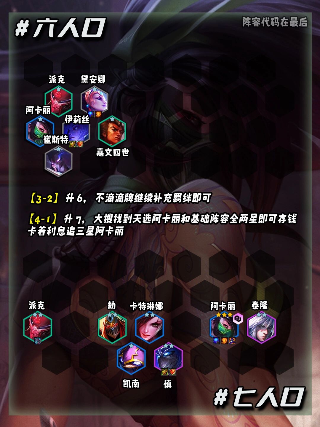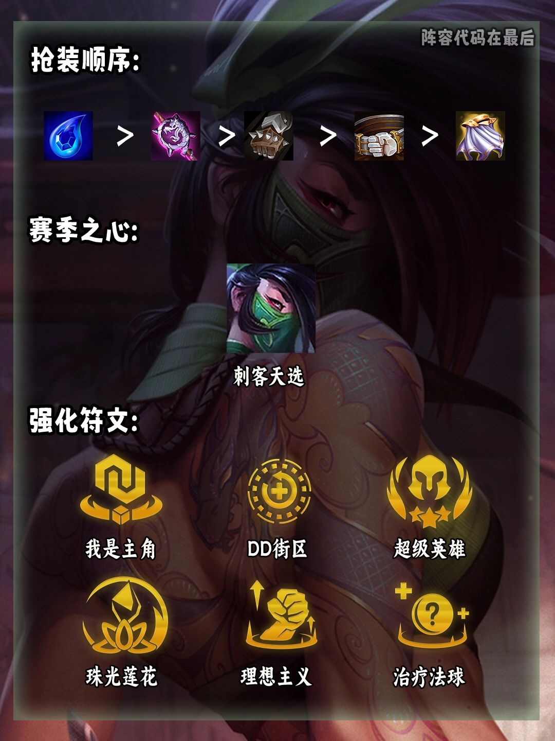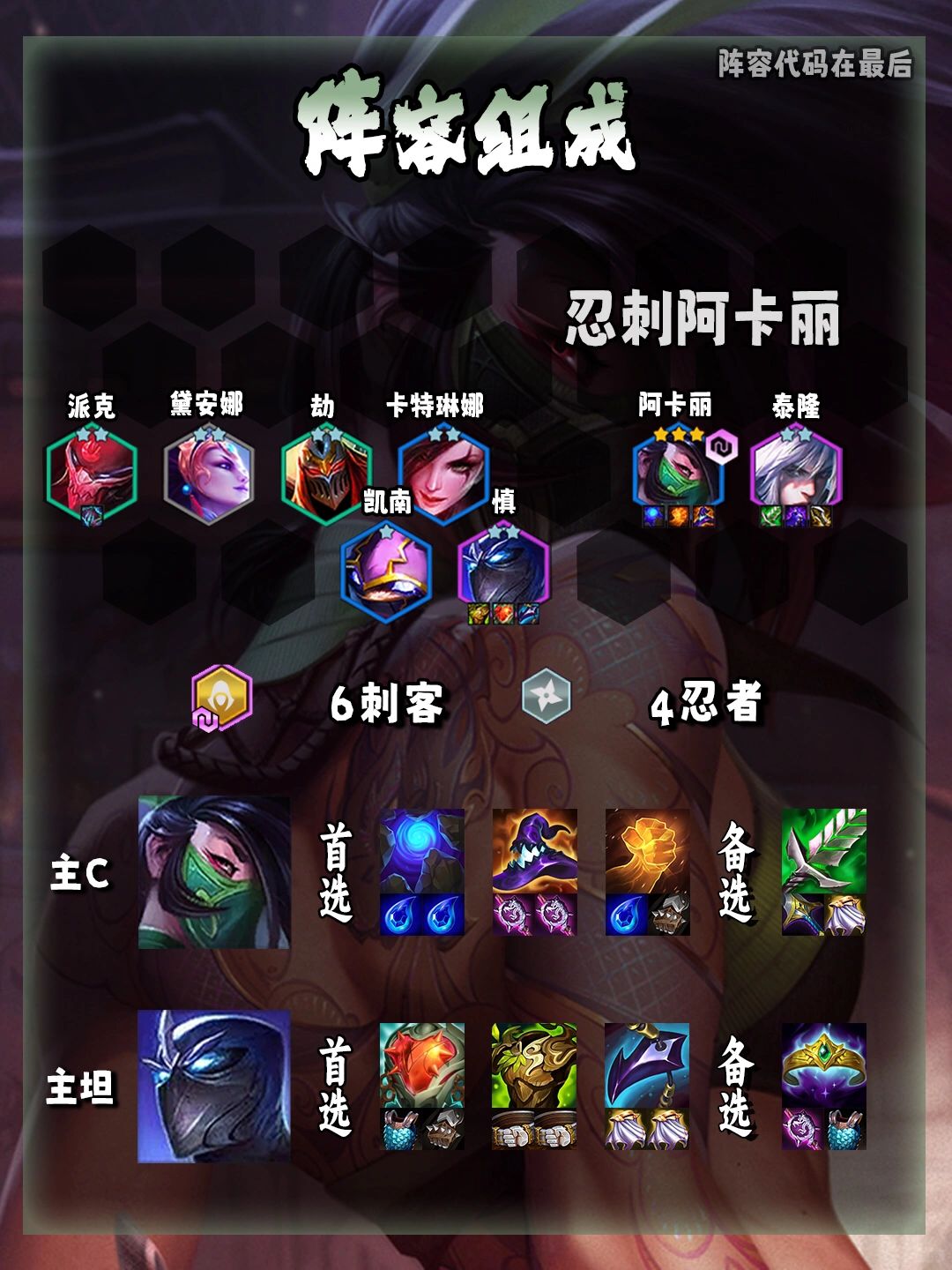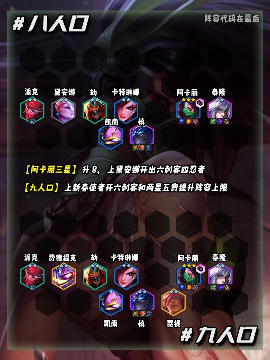 天选阿卡丽自带火炮加上装备蓝buff开局瞬秒对方后排,让对方后排无处躲藏😨 就算是三星四费来了也扛不住阿卡丽两镖💪 这样的阿卡丽简直恐怖如斯👏 👉阵容组成 1⃣️费卡:黛安娜 2⃣️费卡:劫、派克 3⃣️费卡:阿卡丽、凯特琳娜、凯南 4⃣️费卡:泰隆、慎 ⚠️⚠️⚠️ 阿卡丽优先做蓝buff 蓝buff可以加快阿卡丽放技能的频率👊 忍者羁绊为1忍者或4忍者最优哦✊ 如果副C男泰隆(男刀)来的多可以八级追三👈 不仅能做到吃鸡还能体验瞬杀后排的快乐🤩