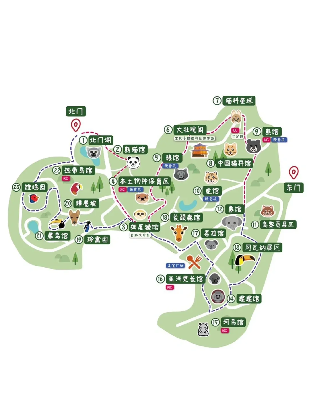 北门➠熊猫馆➠细尾猿馆➠本土动物馆➠狼馆➠中国猫科馆➠熊馆➠虎馆➠大象馆➠高黎贡➠冈瓦纳➠猩猩馆➠河马馆➠亚洲灵长区➠考拉馆➠长颈鹿馆➠珍禽园➠雉鸡馆➠热带鸟馆➠北门