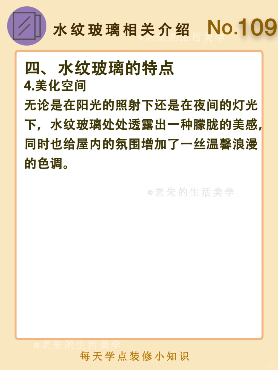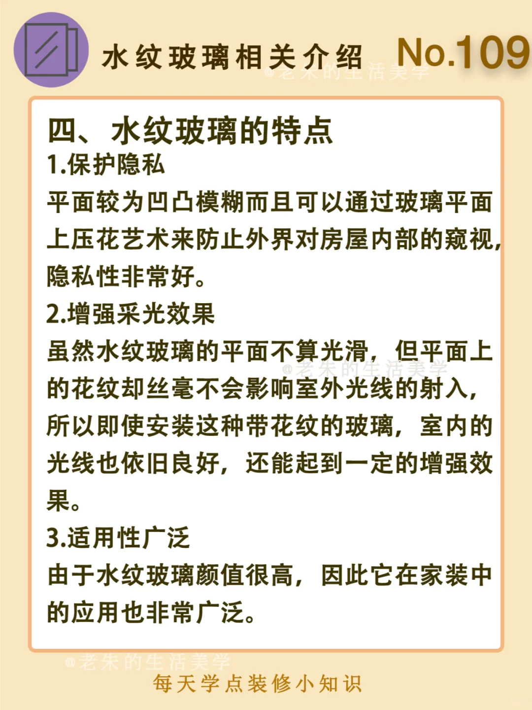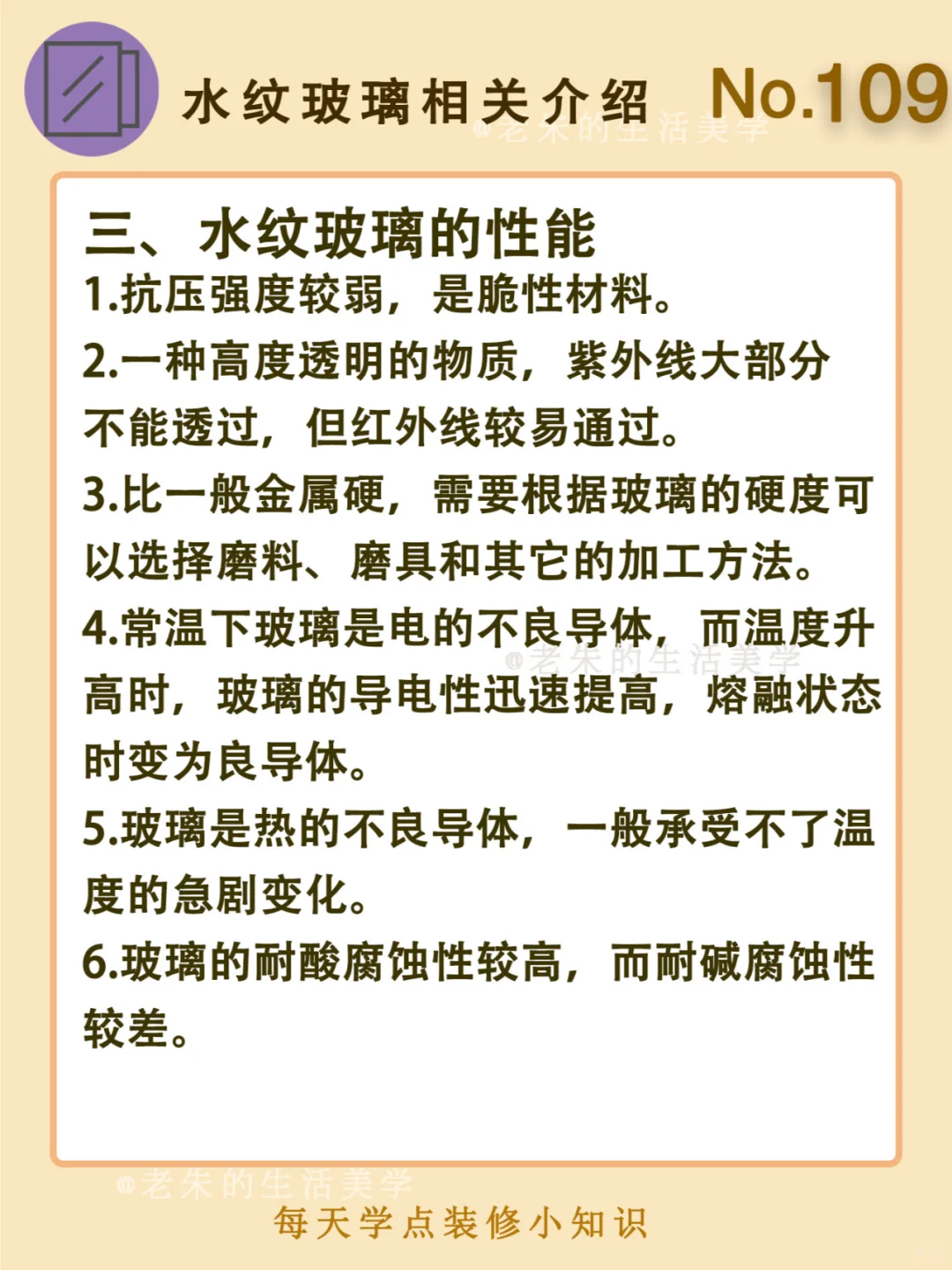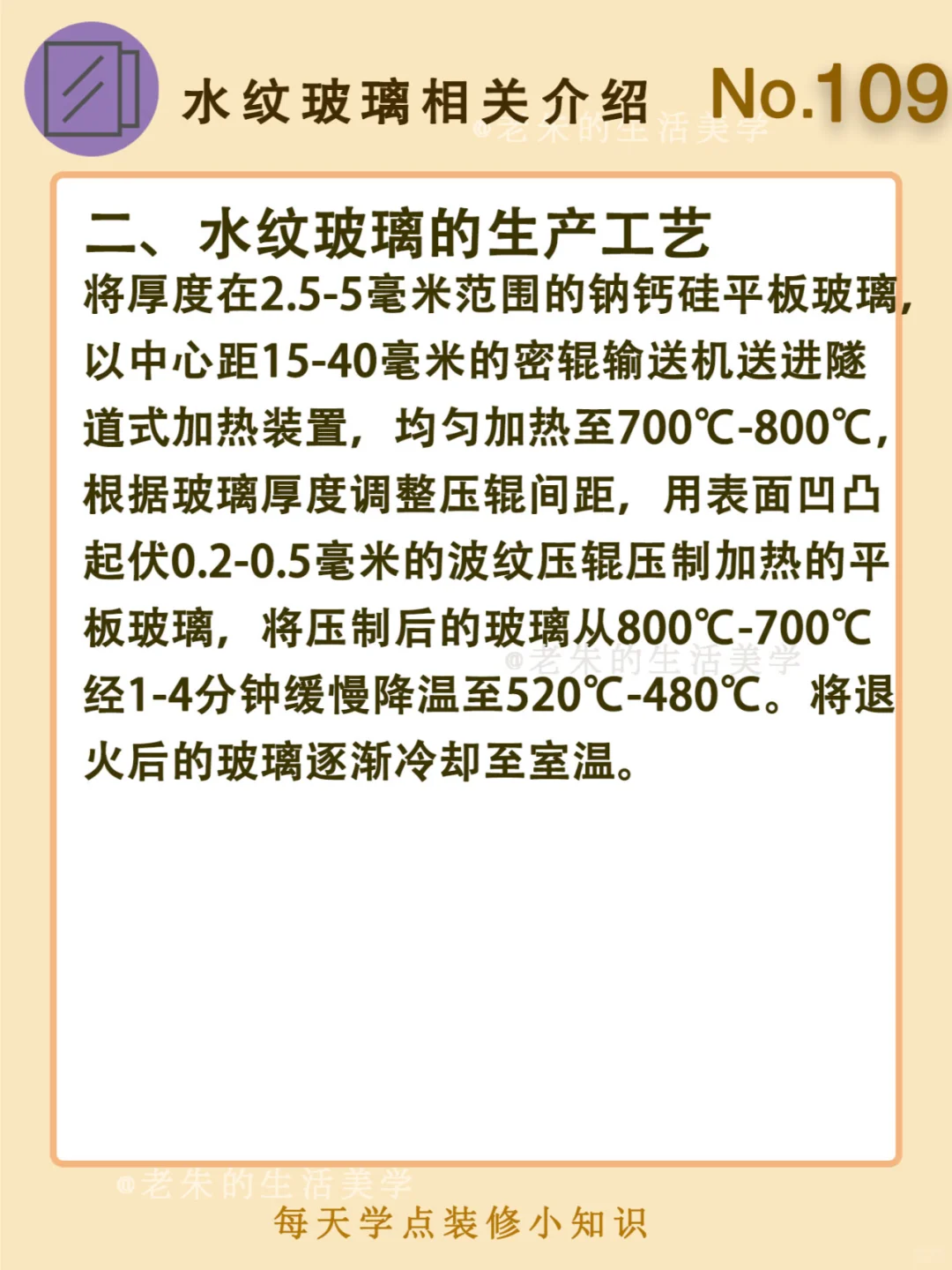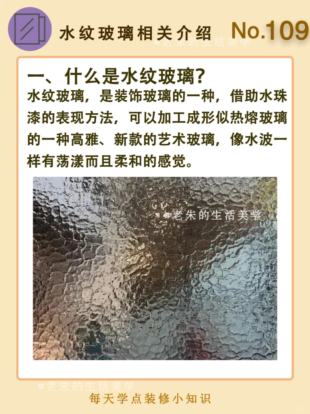 🔆 一、什么是水纹玻璃 二、水纹玻璃的生产工艺 三、水纹玻璃的性能 四、水纹玻璃的特点 🔆 我是老朱 📍坐标天津 前上市公司金牌工长🏅 30年施工经验🛠 承接天津新房装修/老房改造 精心整理关于设计&施工&装修的攻略📝 关注我每日更新🗓 也可以在评论区留下您宝贵的想法与建议💓 让您装修不走弯路✅