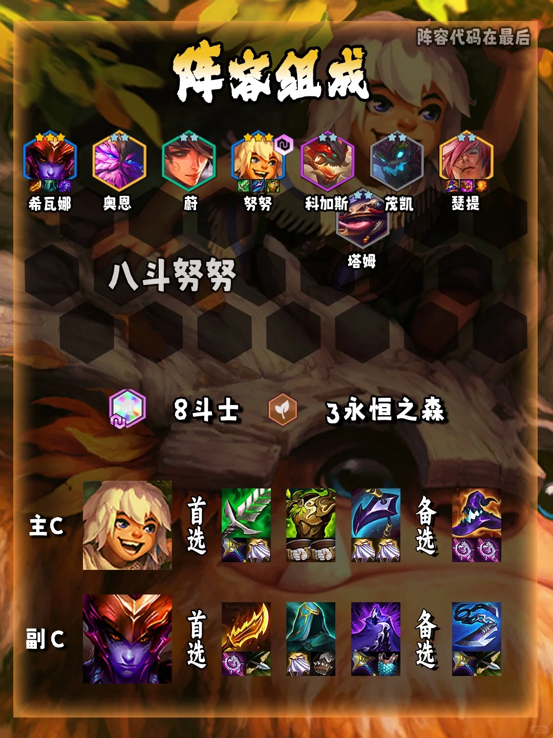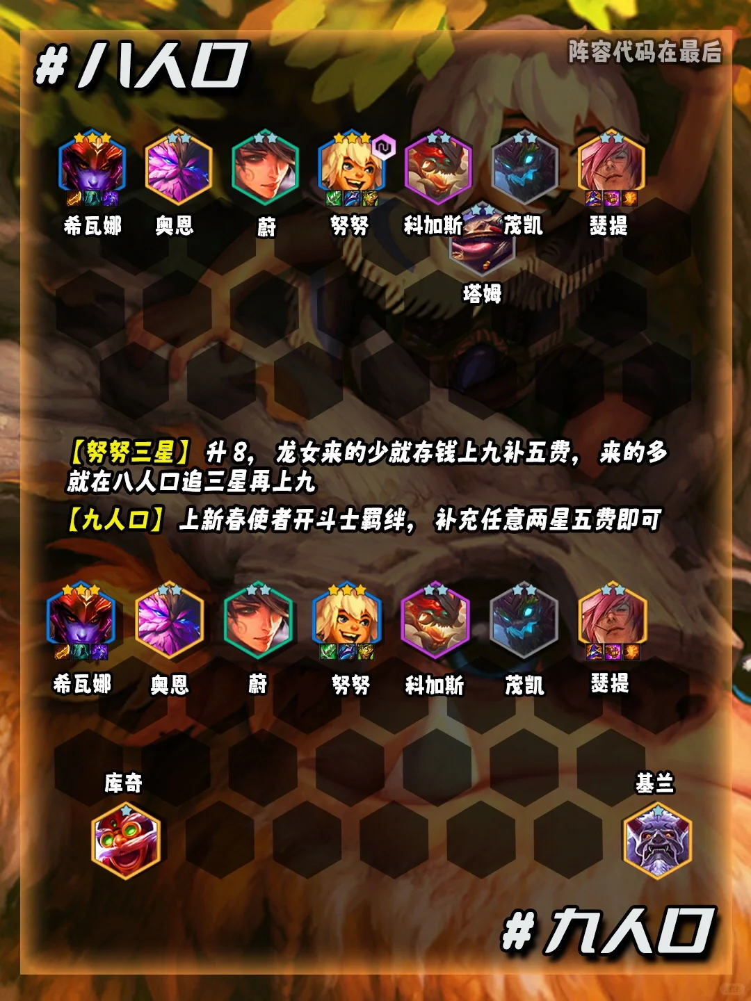 🤔站位思路:八斗士全员放在第一排,主C努努还能凭借挨打回蓝更快启动突破对方前排,配合我们的回血准备做到一口一个,简直就是一个屹立不倒的人头收割机!