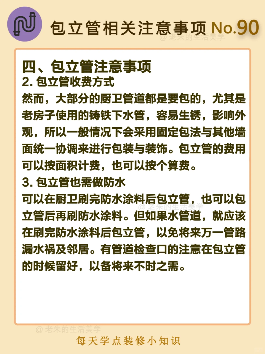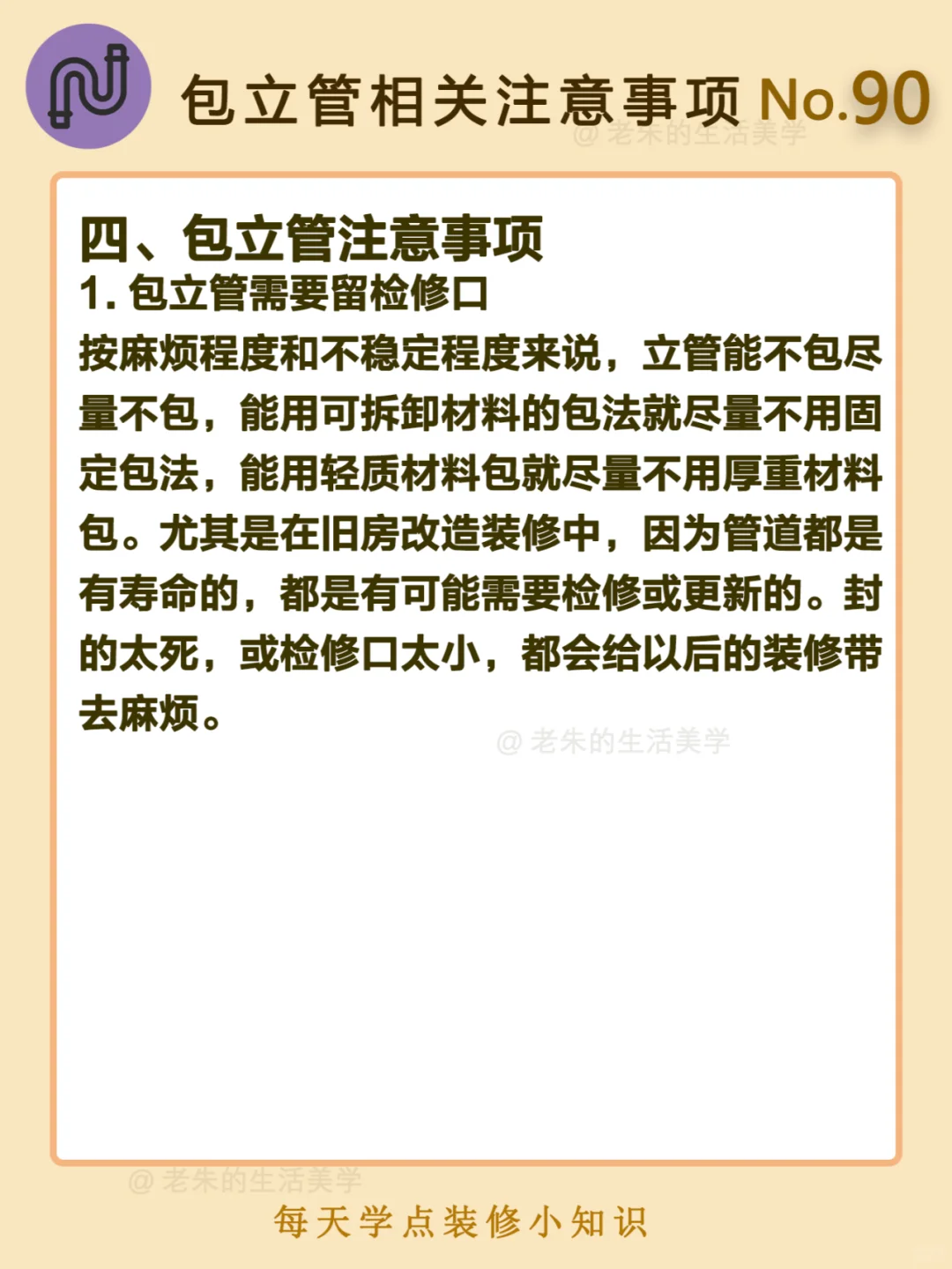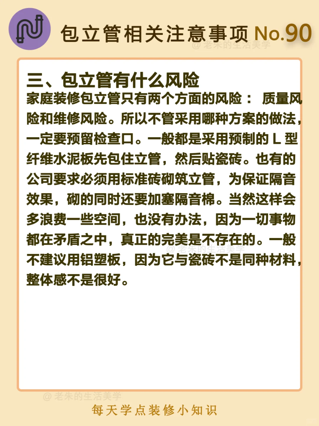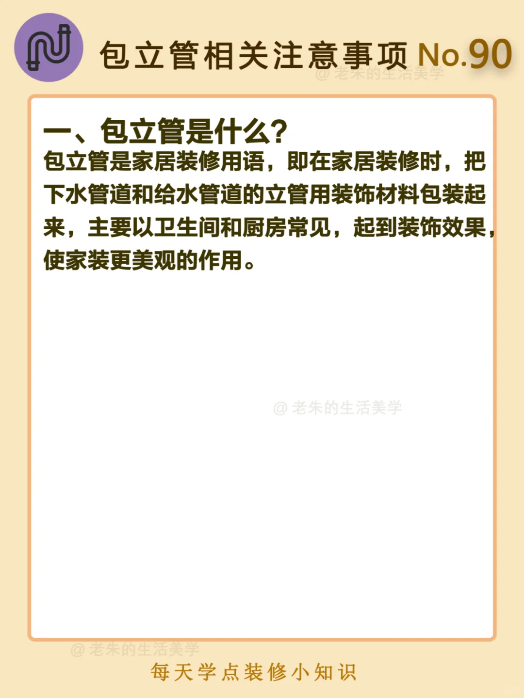 🔔 一、包立管是什么 二、包立管的施工方式 三、包立管的风险 四、包立管的注意事项 🔆 我是老朱 📍坐标天津 前上市公司金牌工长🏅 30年施工经验🛠️ 承接天津新房装修/老房改造 精心整理关于设计&施工&装修的攻略📝 关注我每日更新🗓️ 也可以在评论区留下您宝贵的想法与建议💓 让您装修不走弯路✅