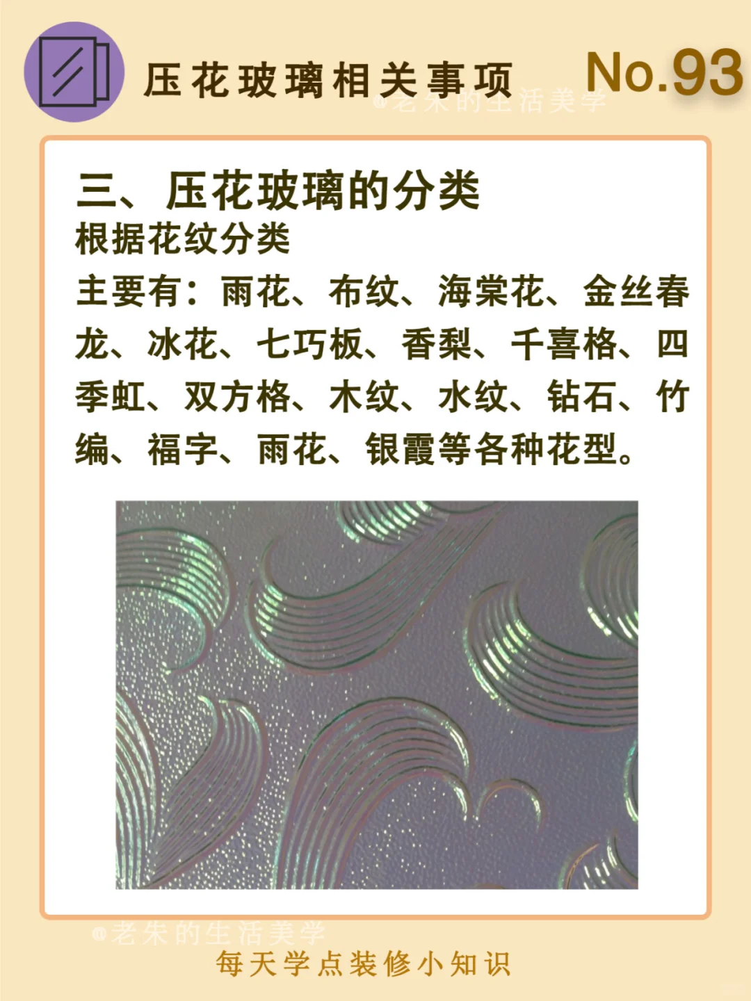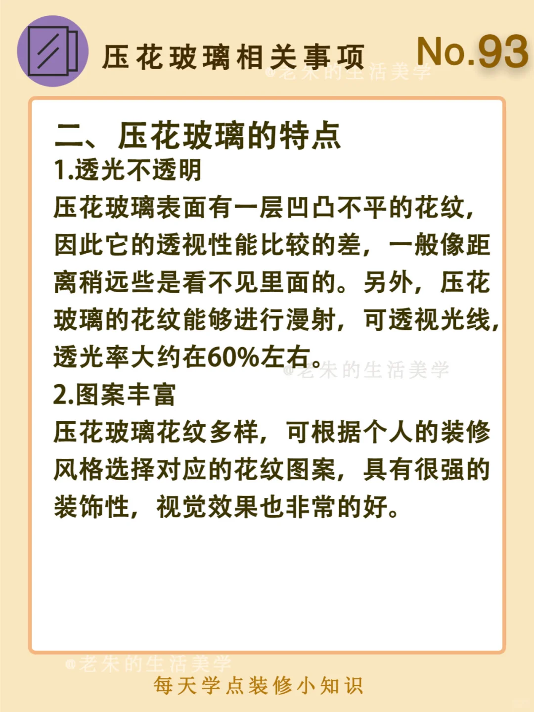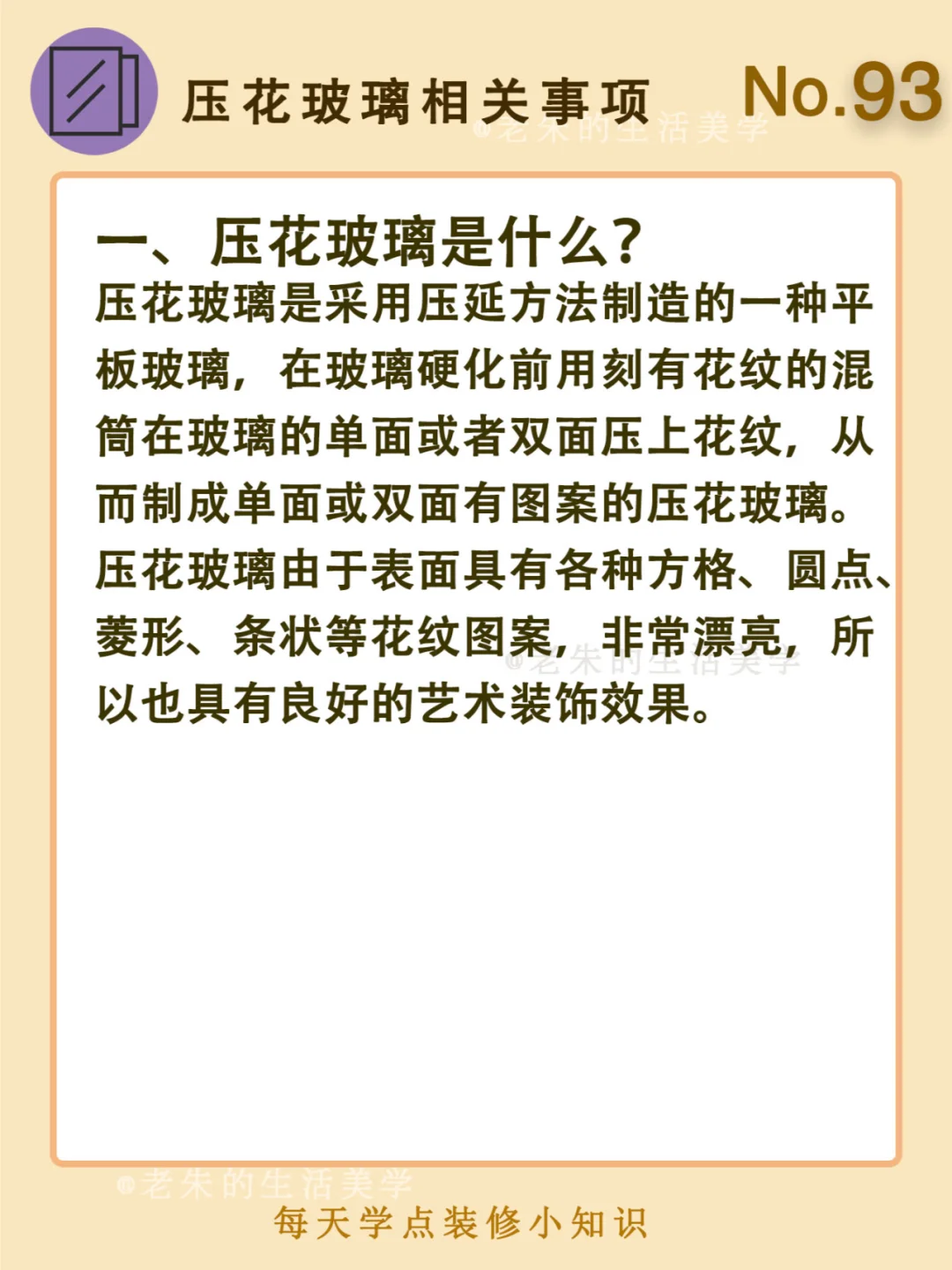 🔆 一、压花玻璃是什么 二、压花玻璃的特点 三、压花玻璃的分类 四、压花玻璃选购攻略 🔆 我是老朱 📍坐标天津 前上市公司金牌工长🏅 30年施工经验🛠️ 承接天津新房装修/老房改造 精心整理关于设计&施工&装修的攻略📝 关注我每日更新🗓️ 也可以在评论区留下您宝贵的想法与建议💓 让您装修不走弯路✅