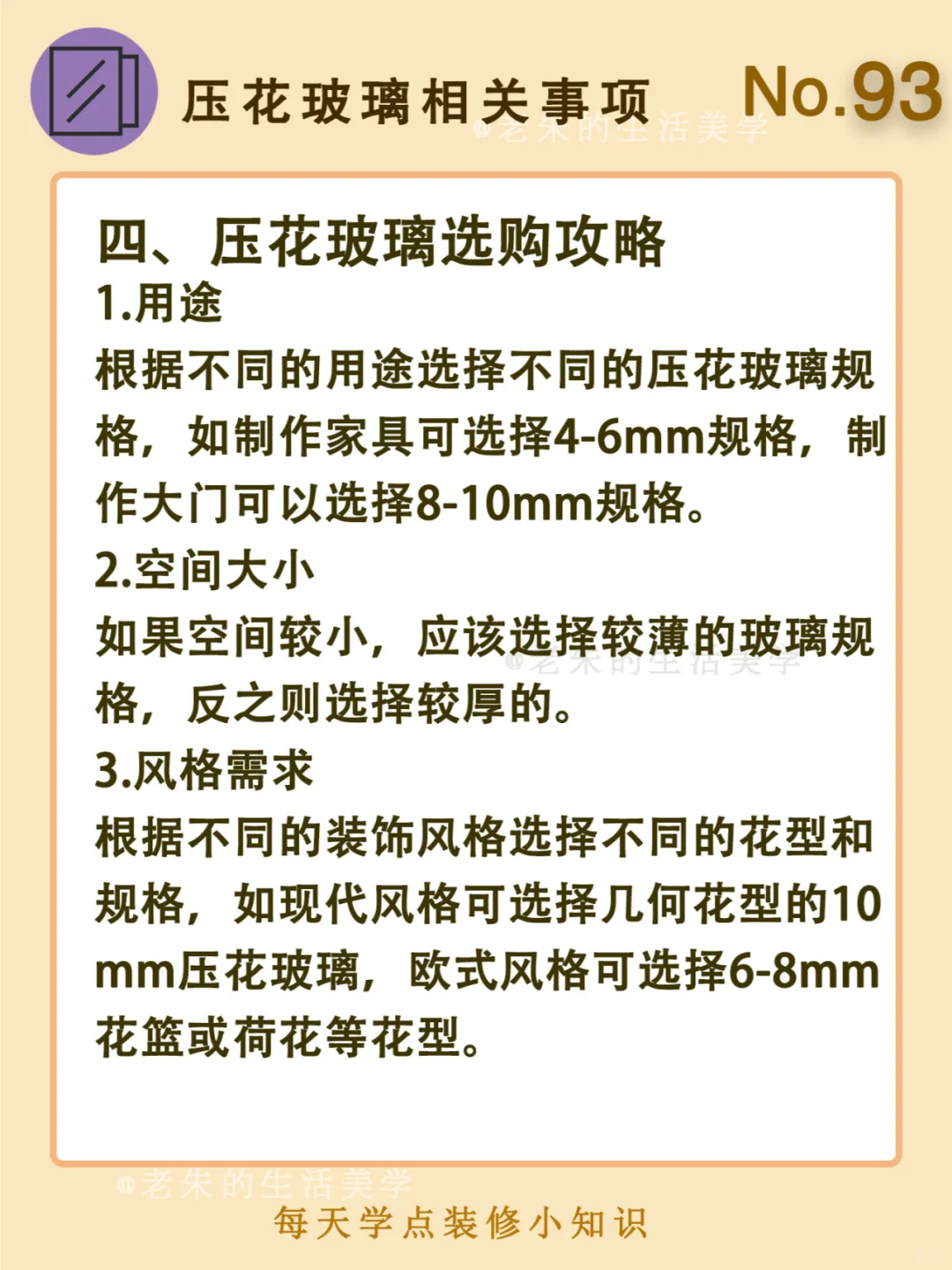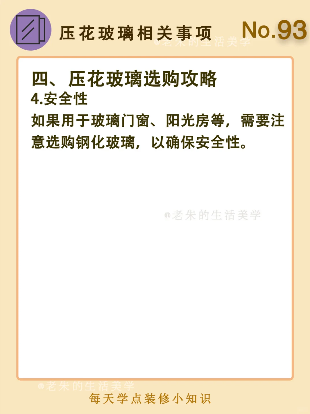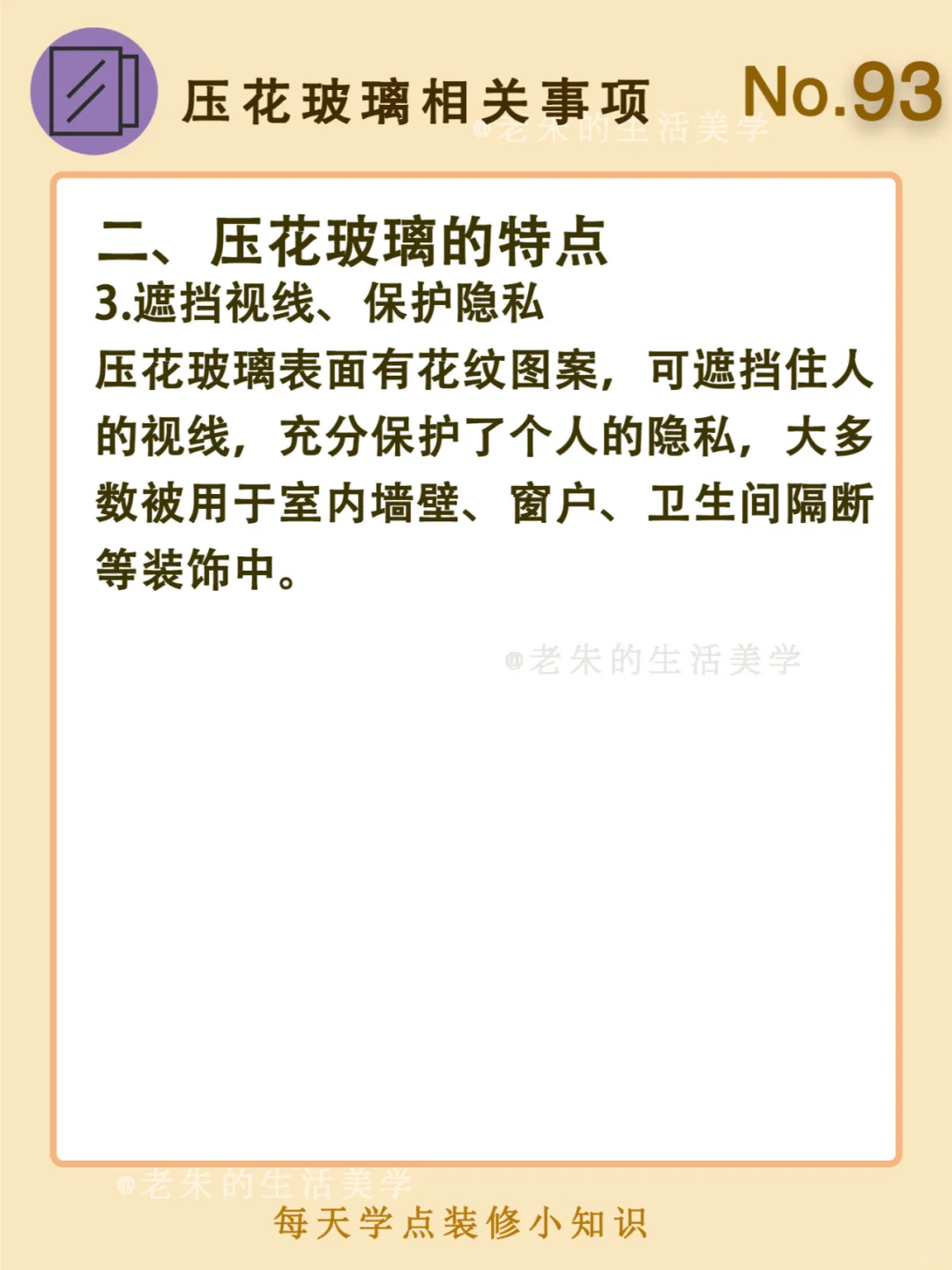 🔆 一、压花玻璃是什么 二、压花玻璃的特点 三、压花玻璃的分类 四、压花玻璃选购攻略 🔆 我是老朱 📍坐标天津 前上市公司金牌工长🏅 30年施工经验🛠️ 承接天津新房装修/老房改造 精心整理关于设计&施工&装修的攻略📝 关注我每日更新🗓️ 也可以在评论区留下您宝贵的想法与建议💓 让您装修不走弯路✅