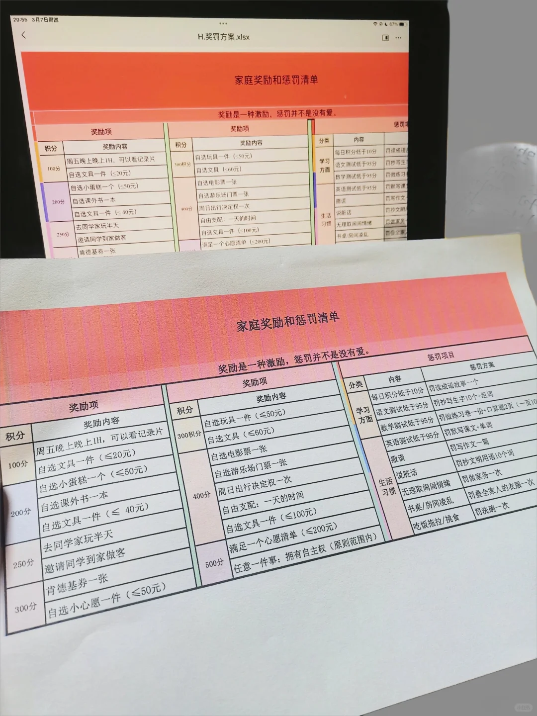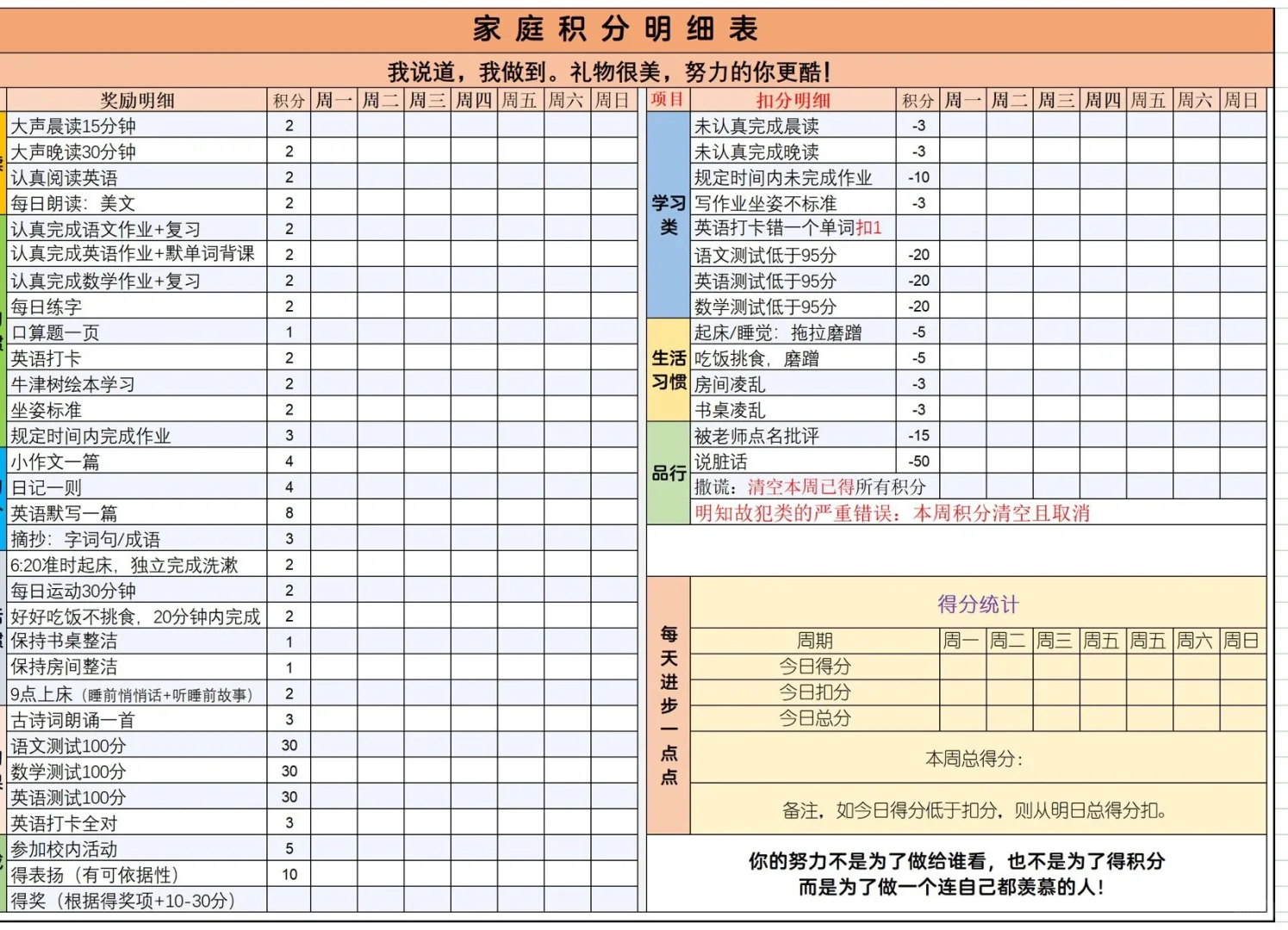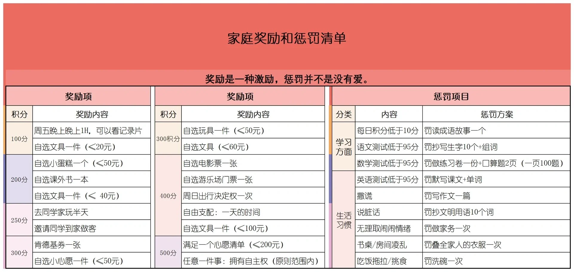 很多爸爸妈妈在教育孩子的时候,时常面临这样的问题:周密规划做了一堆,但是孩子压根不愿意做!三天打鱼 两天晒网,坚持不下去! “如果每天读英语,我就给你买喜欢的东西” “如果考进前三名,我就带你去旅游” “如果按时写作业,我就让你看手机” 虽然奖惩不是最好的方式,但却是必要手段。 用奖励做引导,用惩罚立边界。 可是一味的物质奖励,短期有效,最后,孩子每天正常吃饭也要奖励,严重的是,对奖励最终没有了兴趣。 奖励应该遵循以下原则: 1、不控制孩子,不“威胁”孩子完成任何事情 2、份内之事不奖励,表达感谢或鼓励,不培养孩子只索取不付出的习惯 3、遵循85%原则,85%是孩子已经掌握的,难度刚刚好,目标不能过大或过小 4、说到要能够做到 6、奖励要是孩子需要的,并且一定要及时 7、奖励孩子努力的过程,而非只看重结果 除了物质奖励,更应该给孩子精神奖励: 1、奖励孩子一次课外活动,比如研学活动(给他享受探索的快乐) 2、奖励孩子可以决定明天吃什么(给他 自由选择的权利) 3、奖励孩子可以安排周末的一天(给他选择陪伴的方式) 4、奖励孩子看一场展览,话剧、舞台剧(培养他审美的能力) 5.奖励孩子可以邀请同学来家里做客(给他主人翁意识) 6.奖励孩子实现一个小愿望(享受努力带来的结 果和快乐) 7.奖励他在家当一天父母,感受长辈的一天(责任担当) 8.奖励孩子可以做家里的教练(指挥员)感受权利和应该担当的责任 9.奖励出去玩不定回家的具体时间(给他享受充分快乐的时间) 用好家庭管理积分制度,让父母管理培养孩子,事半功倍! 一开始由奖励推动,再到逐渐减少奖励,最后赋予孩子正向的身份,孩子会在正确激励方式下,持续获得能量,养成好习惯,最终形成自驱力