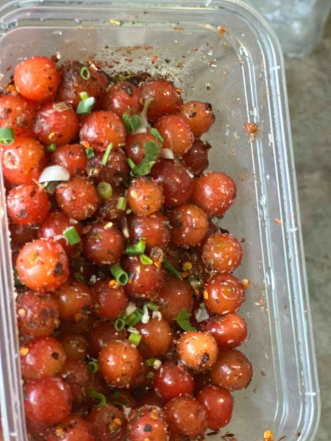 四川人的凉拌小樱桃 这么晚了,冰箱什么吃的都没有,只有小樱桃。吃一天小樱桃,换合味道。胡辣子搞点,花椒面来点,盐,味精,鸡精,白糖,巴拉巴拉味道绝绝子