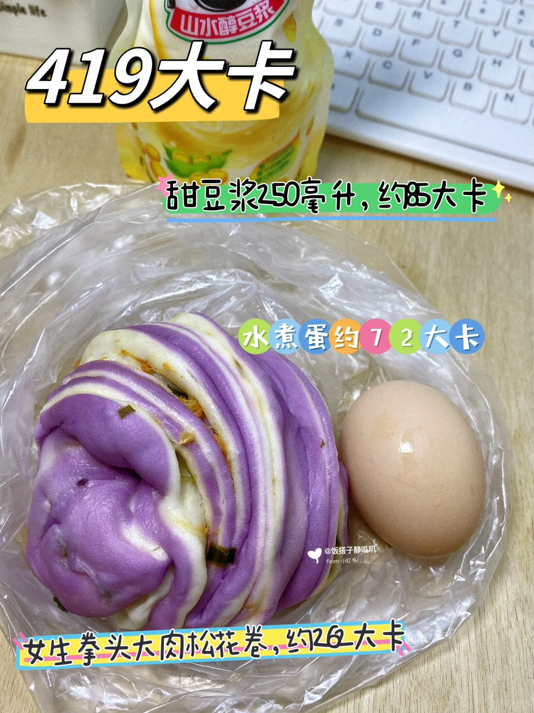 2⃣️豆浆+肉松花卷+鸡蛋,约419大卡