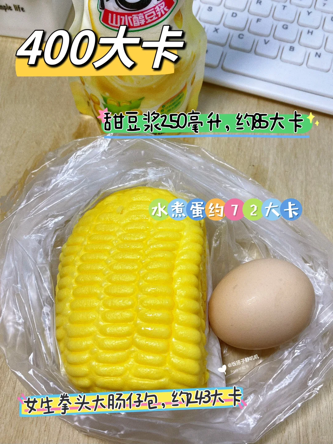 4⃣️ 豆浆+肠仔包+鸡蛋,约400大卡