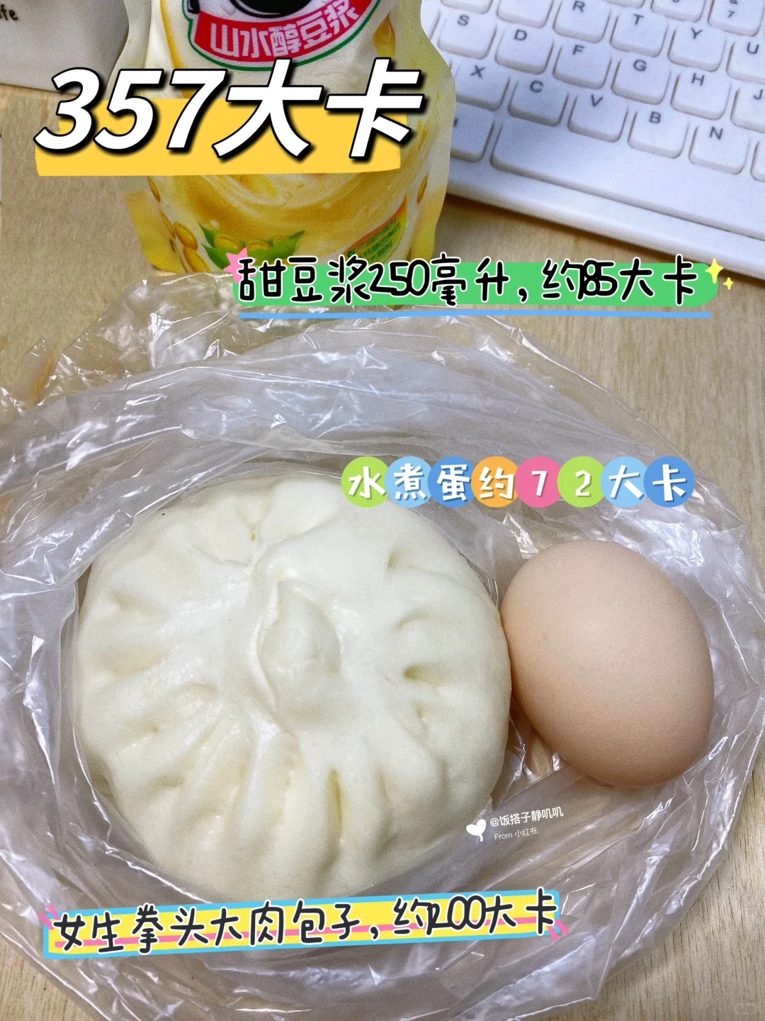 1⃣️豆浆+肉包+鸡蛋,约357大卡