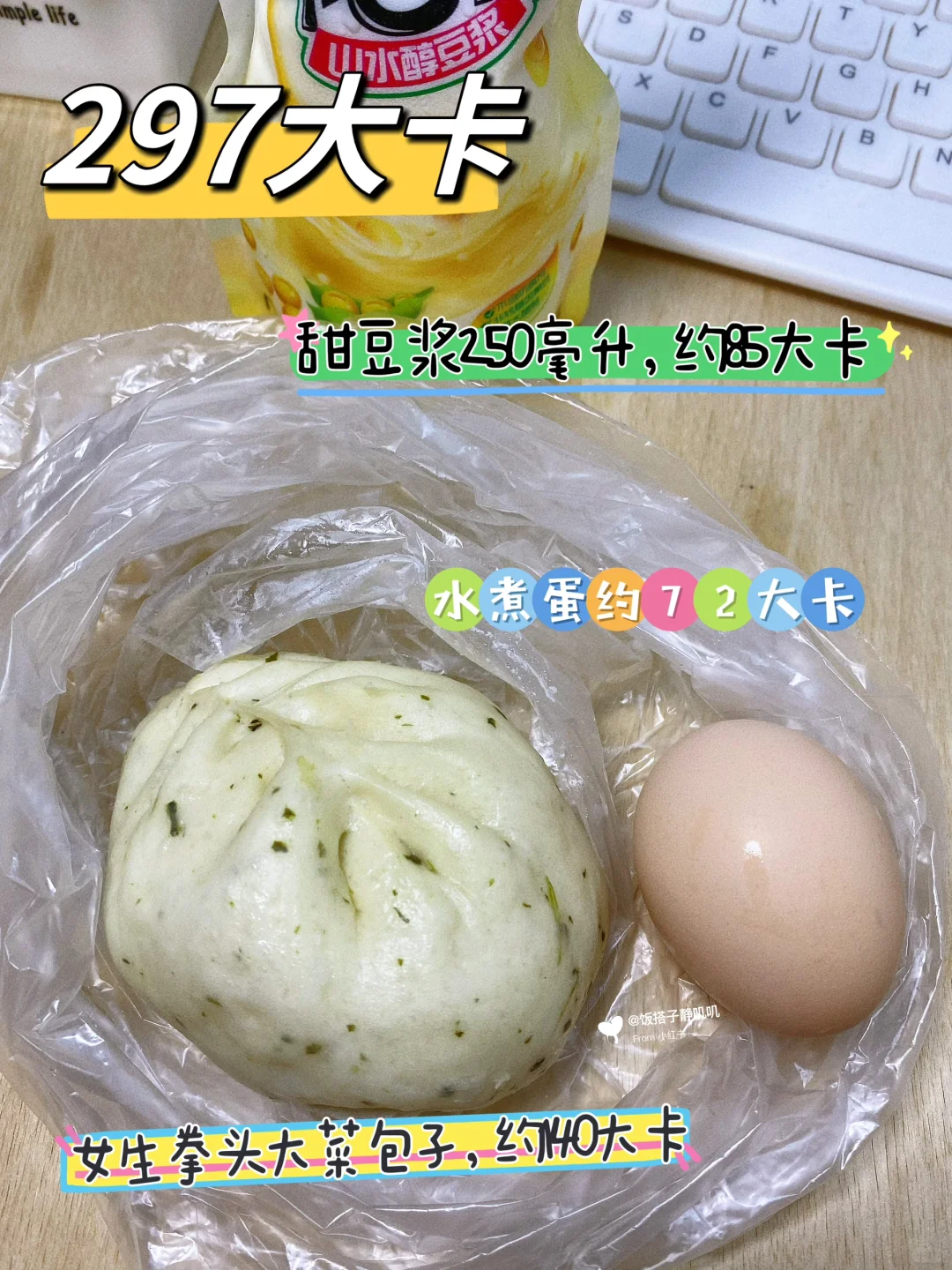 3⃣️豆浆+菜包+鸡蛋,约297大卡