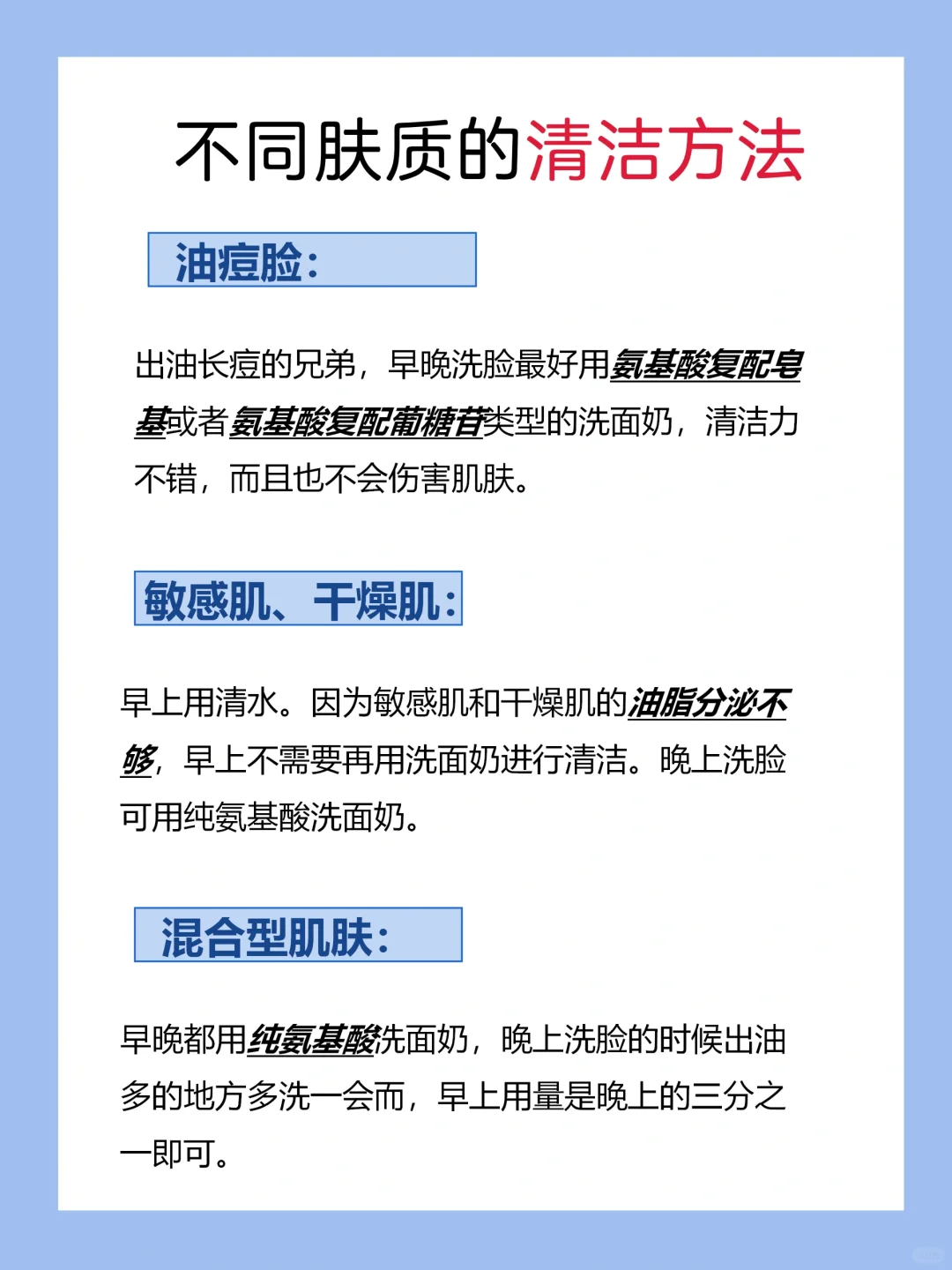早上用清水。因为敏感肌和干燥肌的油脂分泌不够,早上不需要再用洗面奶进行清洁。晚上洗脸可用纯氨基酸洗面奶。