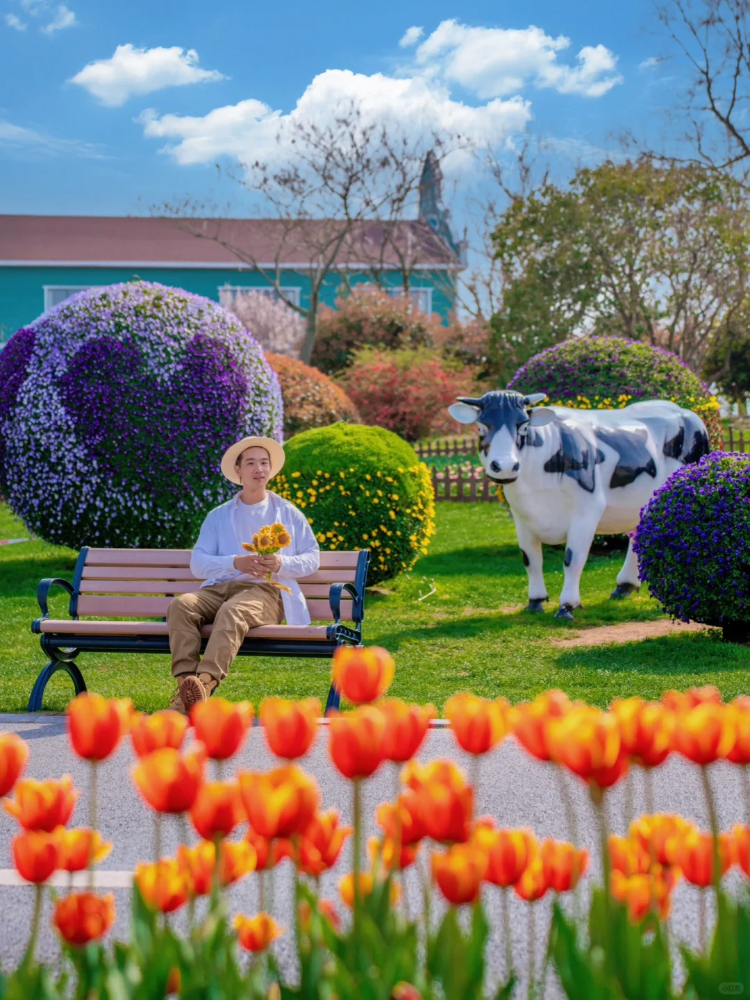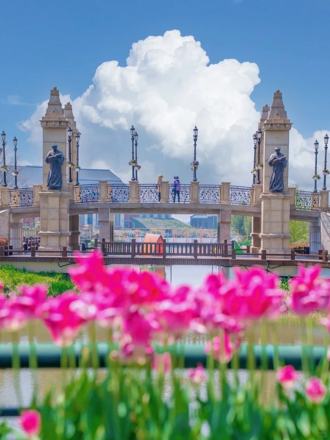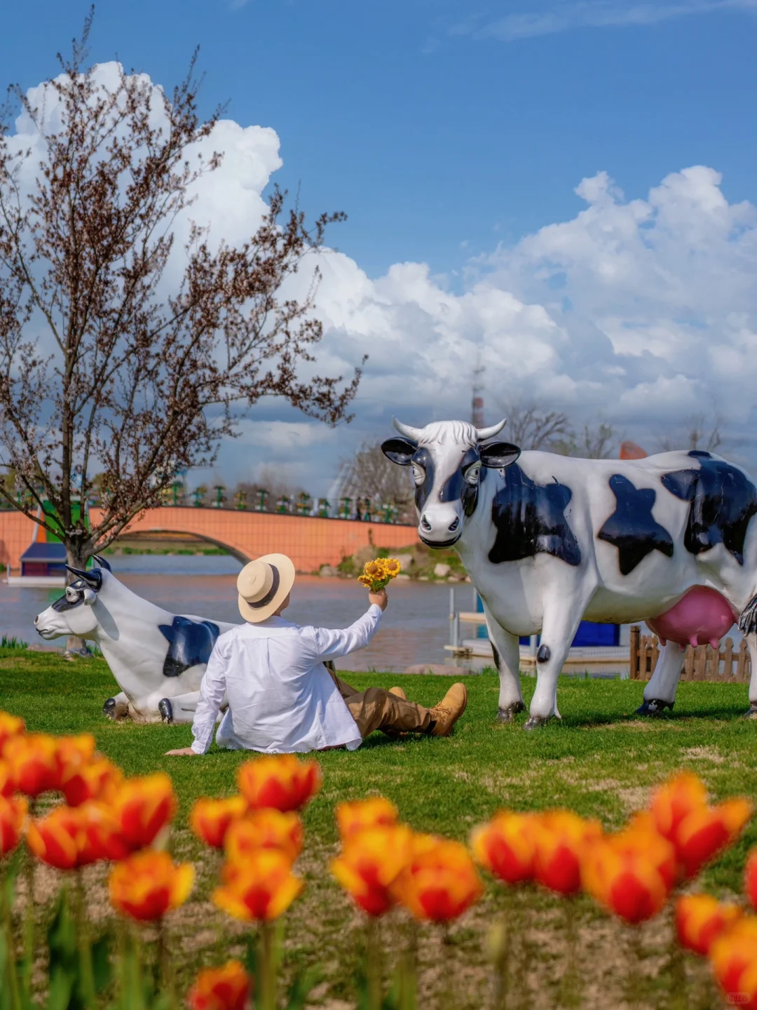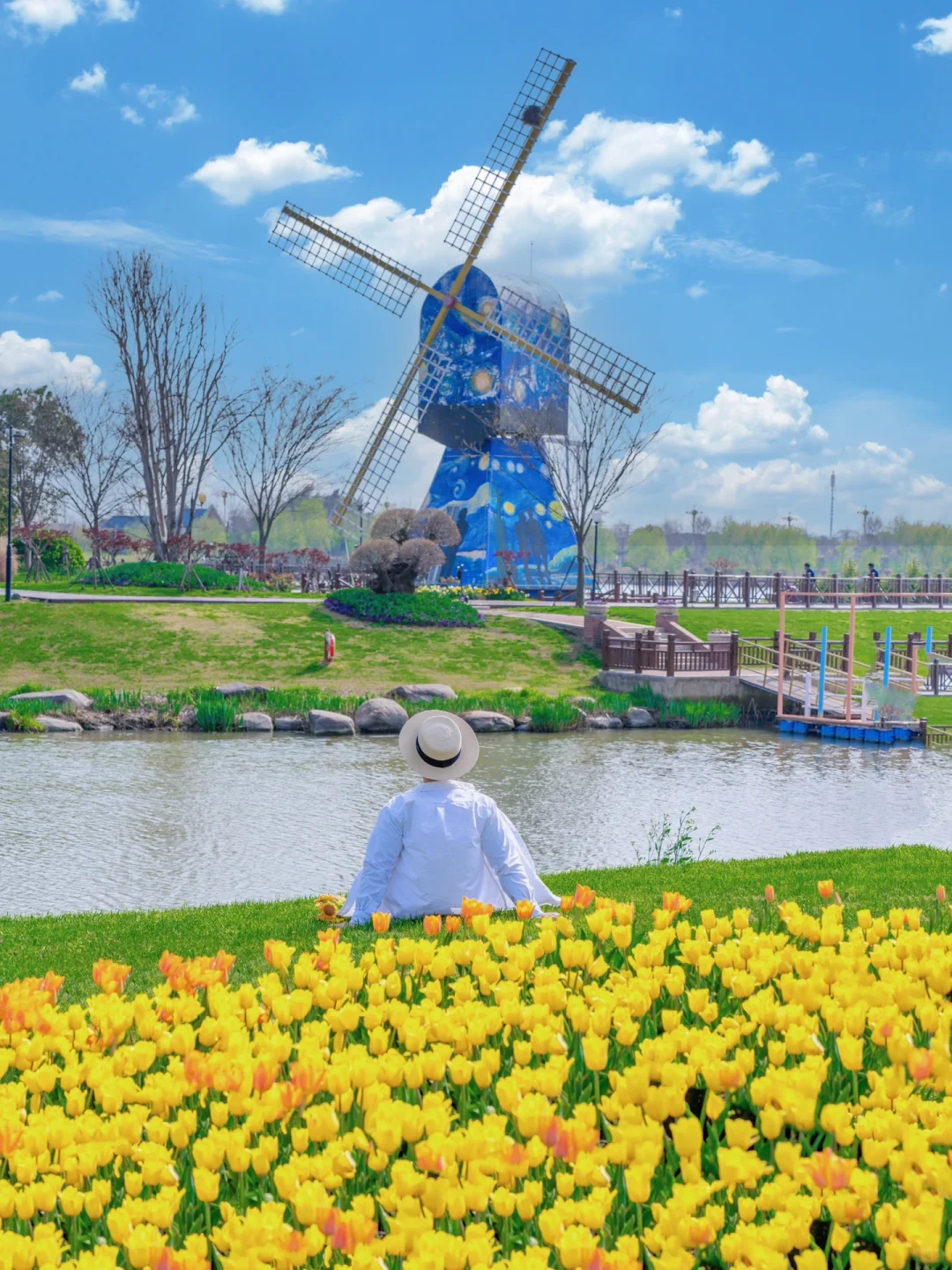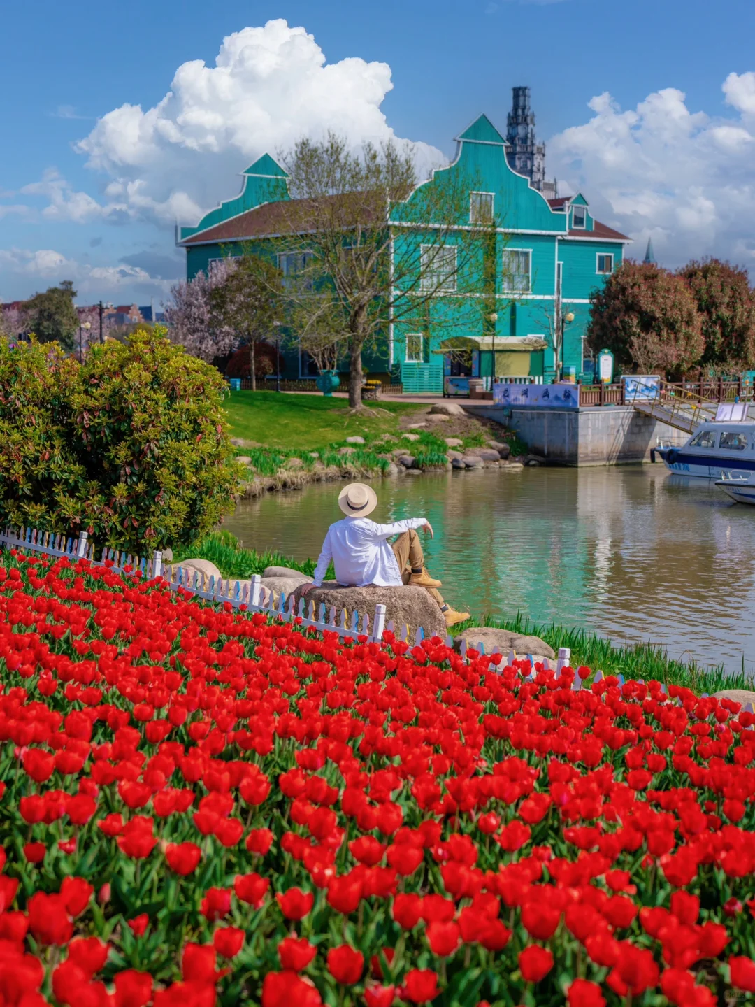 阳光好好的,千亩郁金香花海进入盛花期,而且搭配远处的欧式建筑还有风车、热气球、黑天鹅、草坪…站在花丛中,让人仿佛置身于荷兰的田园风光中,怎么拍都好好看~