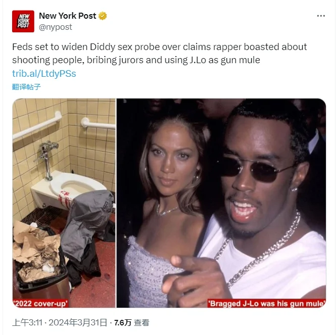 《New York Post》报道:联邦调查局将会扩大对“吹牛老爹”Diddy的性侵调查,声称他曾吹嘘射击人、贿赂陪审团员以及利用珍妮弗·洛佩兹(Jennifer Lopez)偷带枪支进入夜店。
