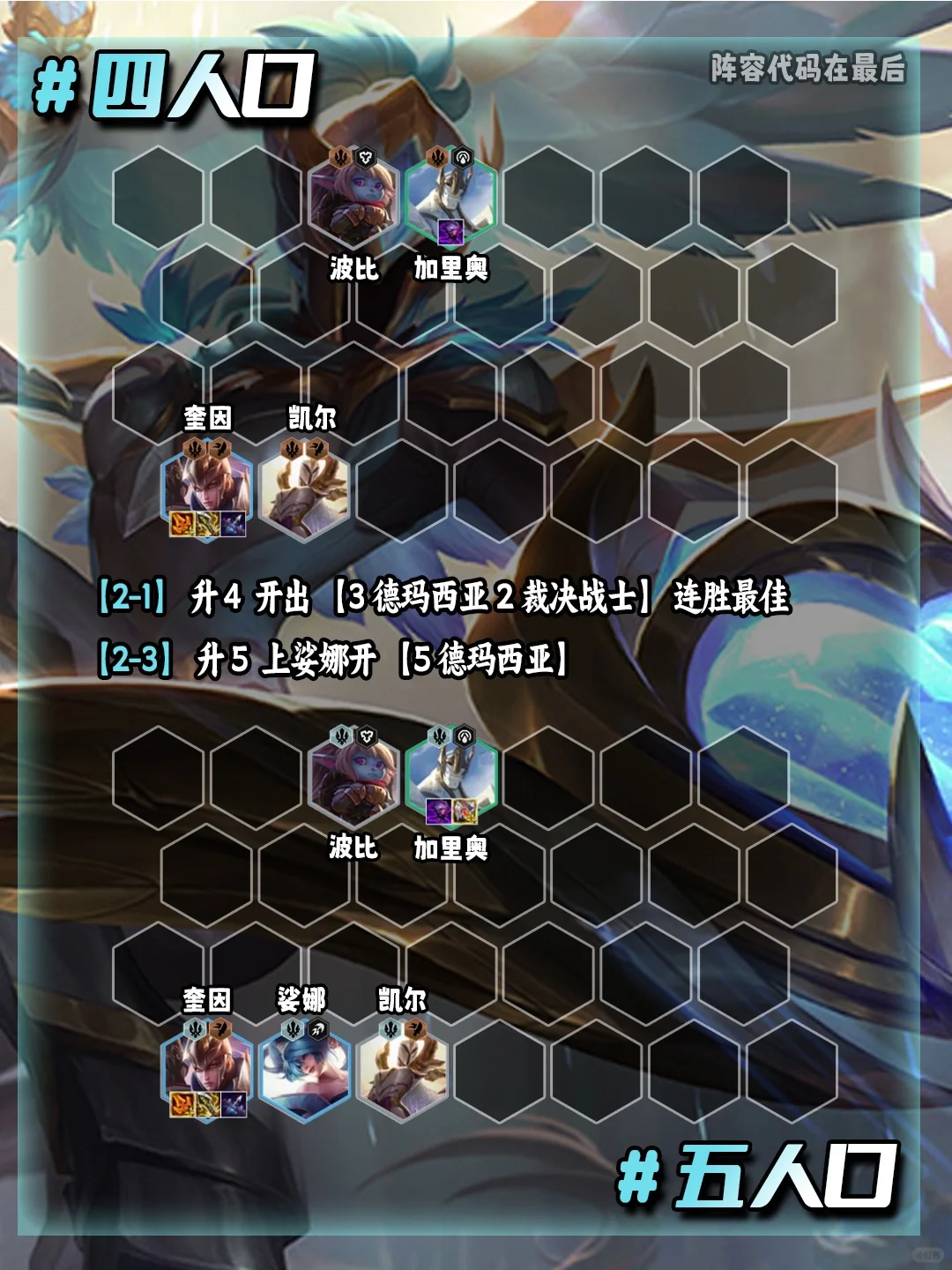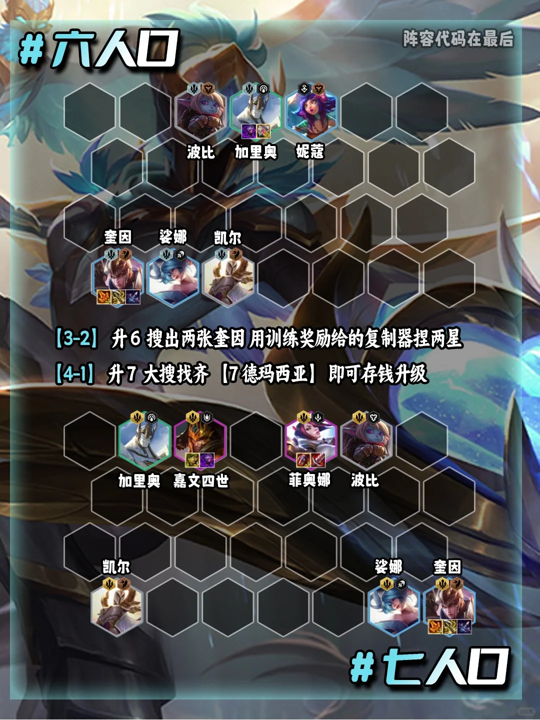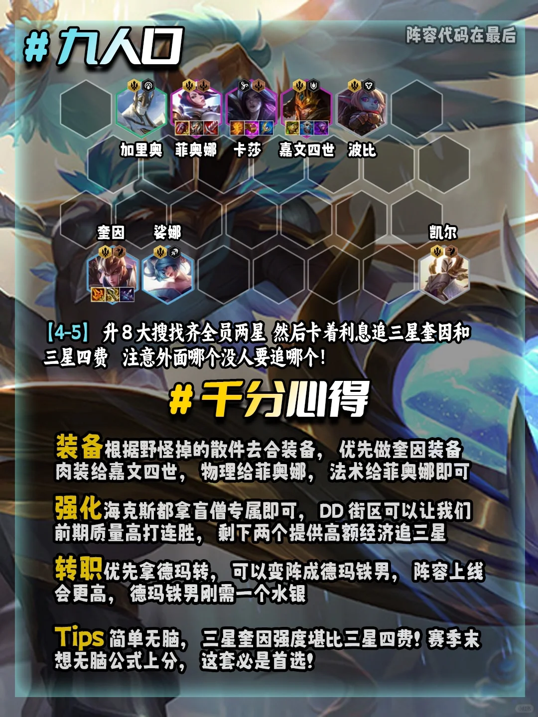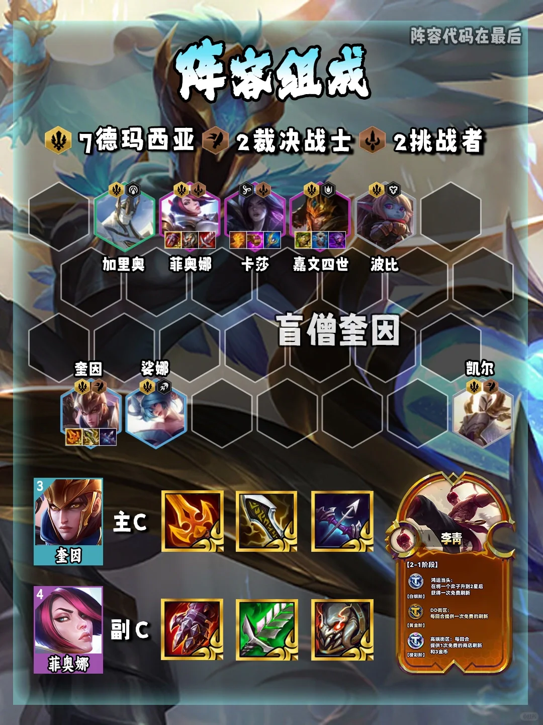 姐妹们!简单易上手的赛季末上分阵容!新手必学! 盲僧奎因,只需要记住一个羁绊即可-德玛西亚!然后酷酷追三星就能吃鸡!