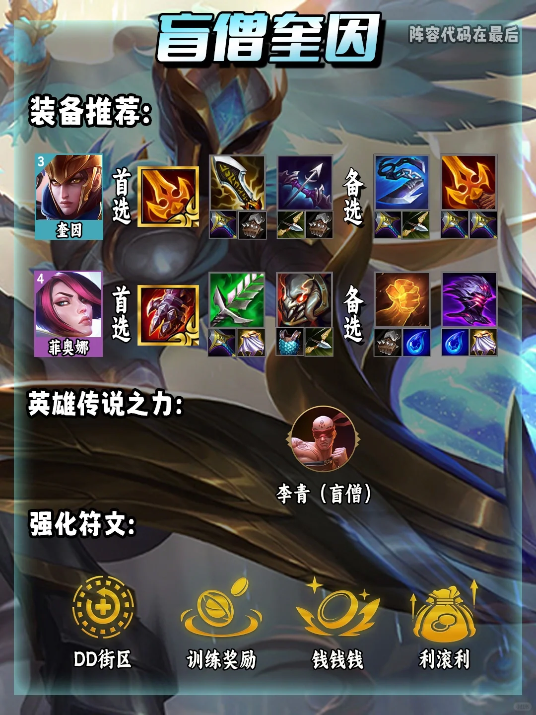 姐妹们!简单易上手的赛季末上分阵容!新手必学! 盲僧奎因,只需要记住一个羁绊即可...