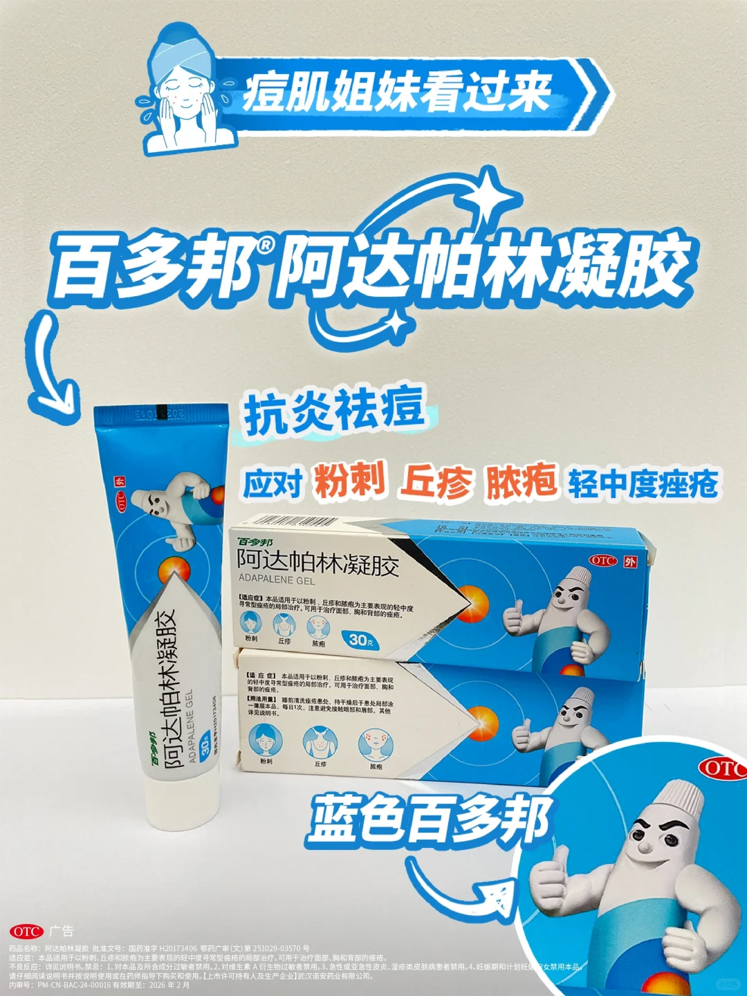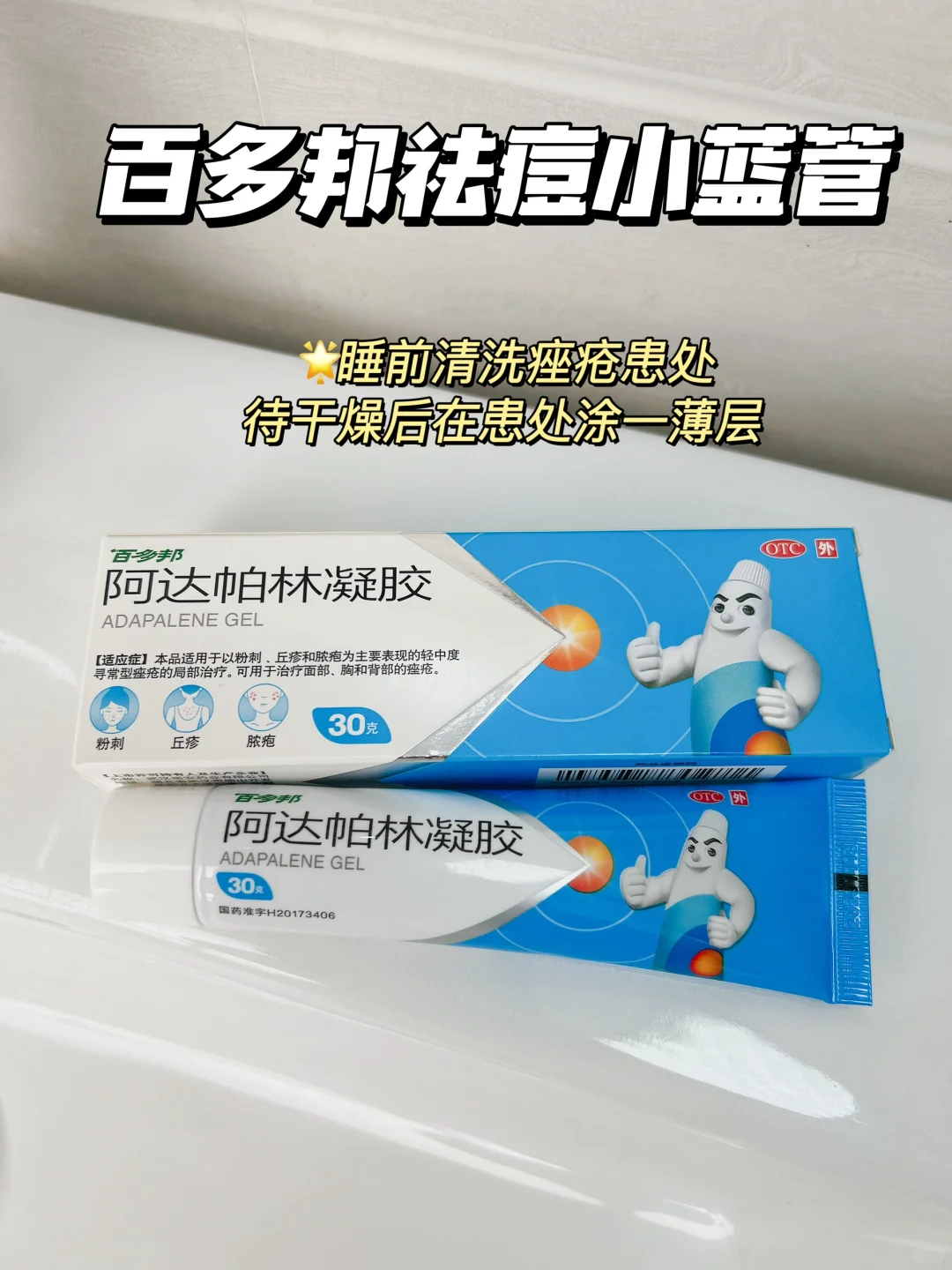 他家的百多邦祛痘小蓝管,就是第三代维A酸,适用于粉刺、丘疹和脓疱为主要表现的轻中度寻常型痤疮,面部、胸和背部都可以用,每天睡前用一次。