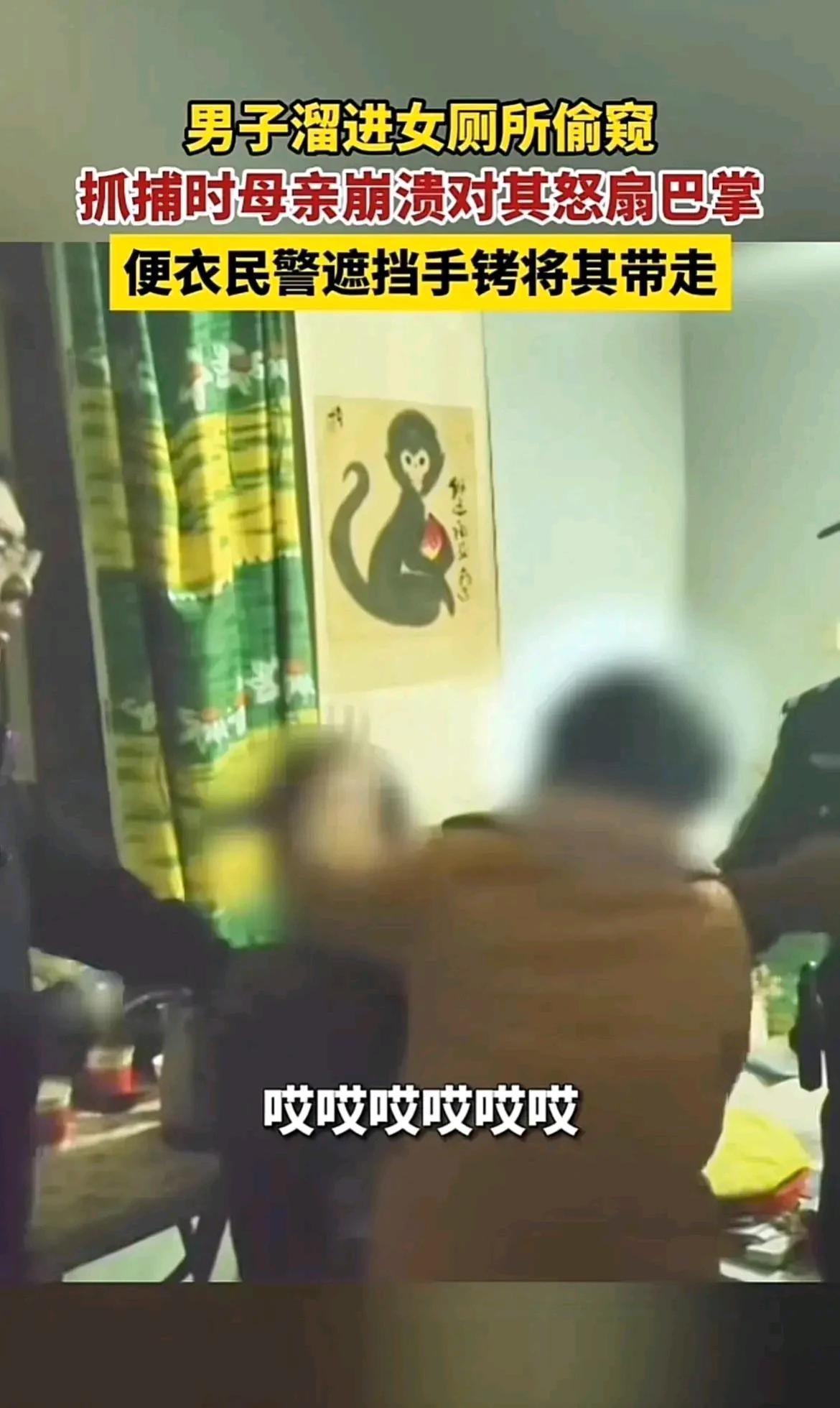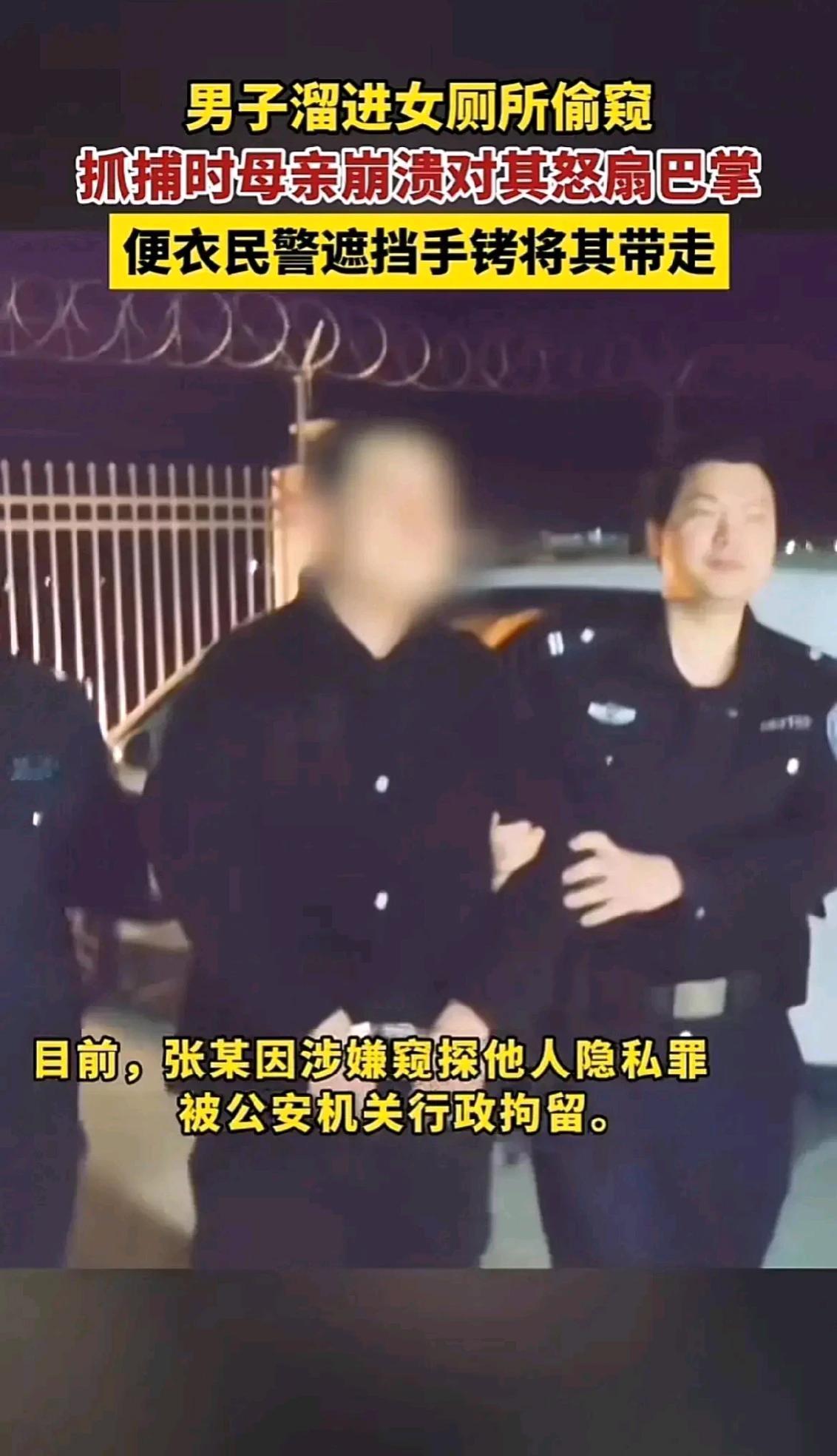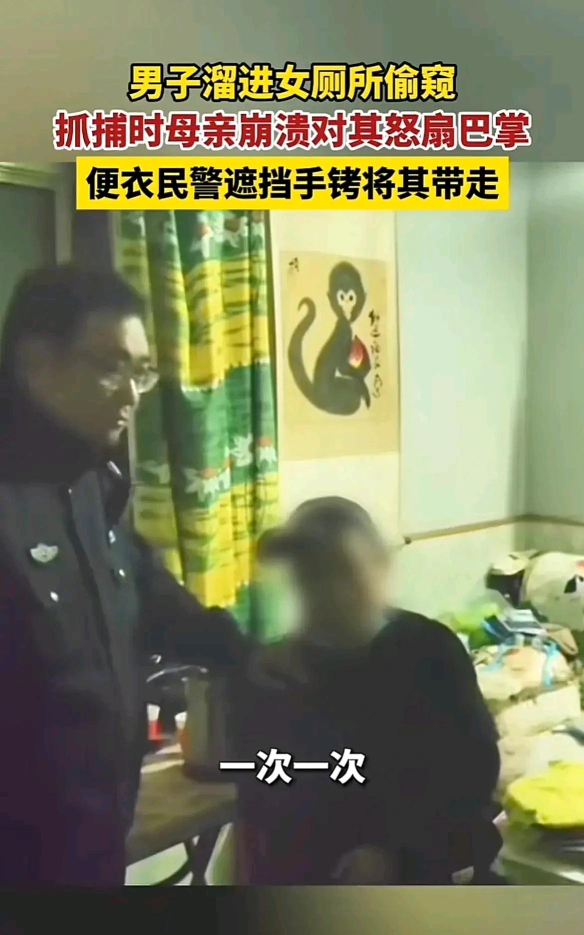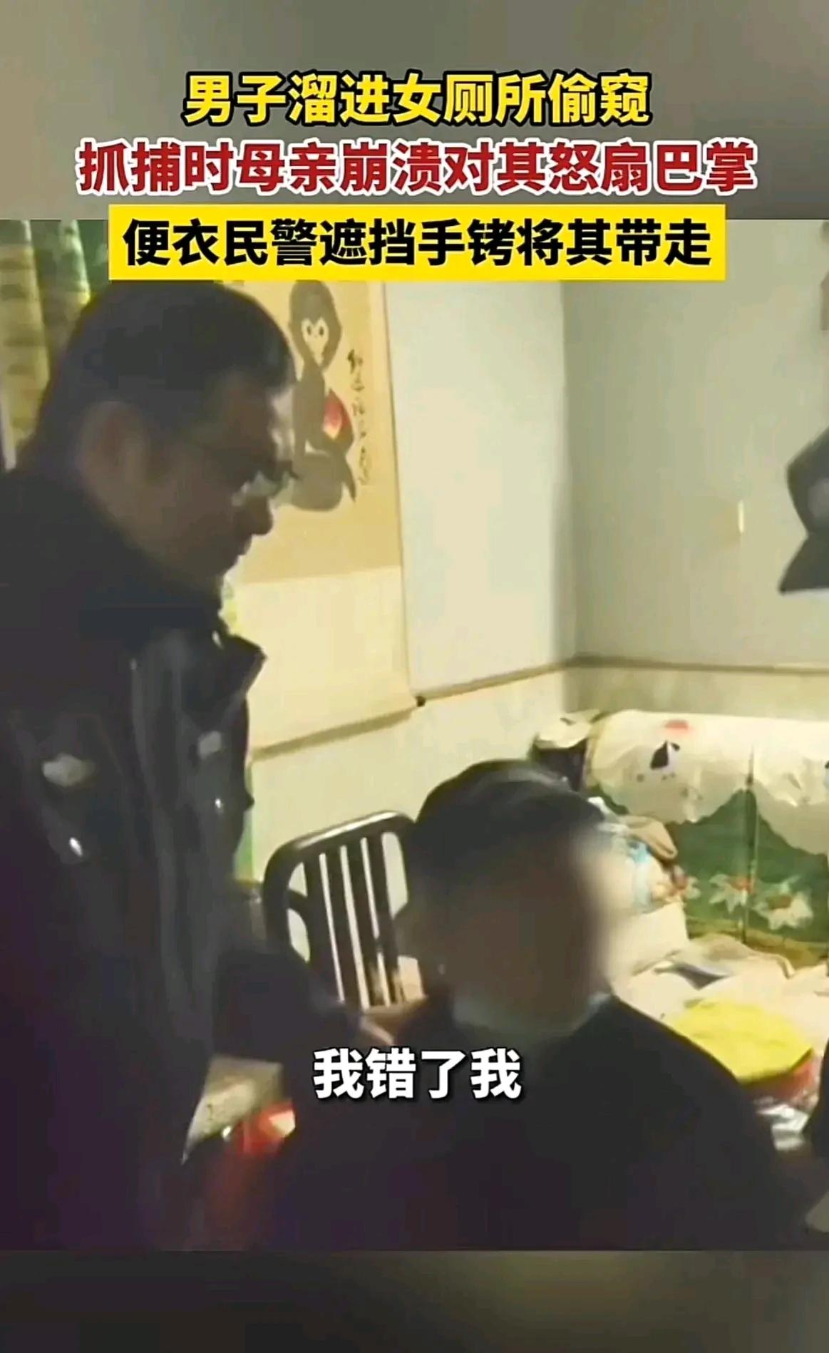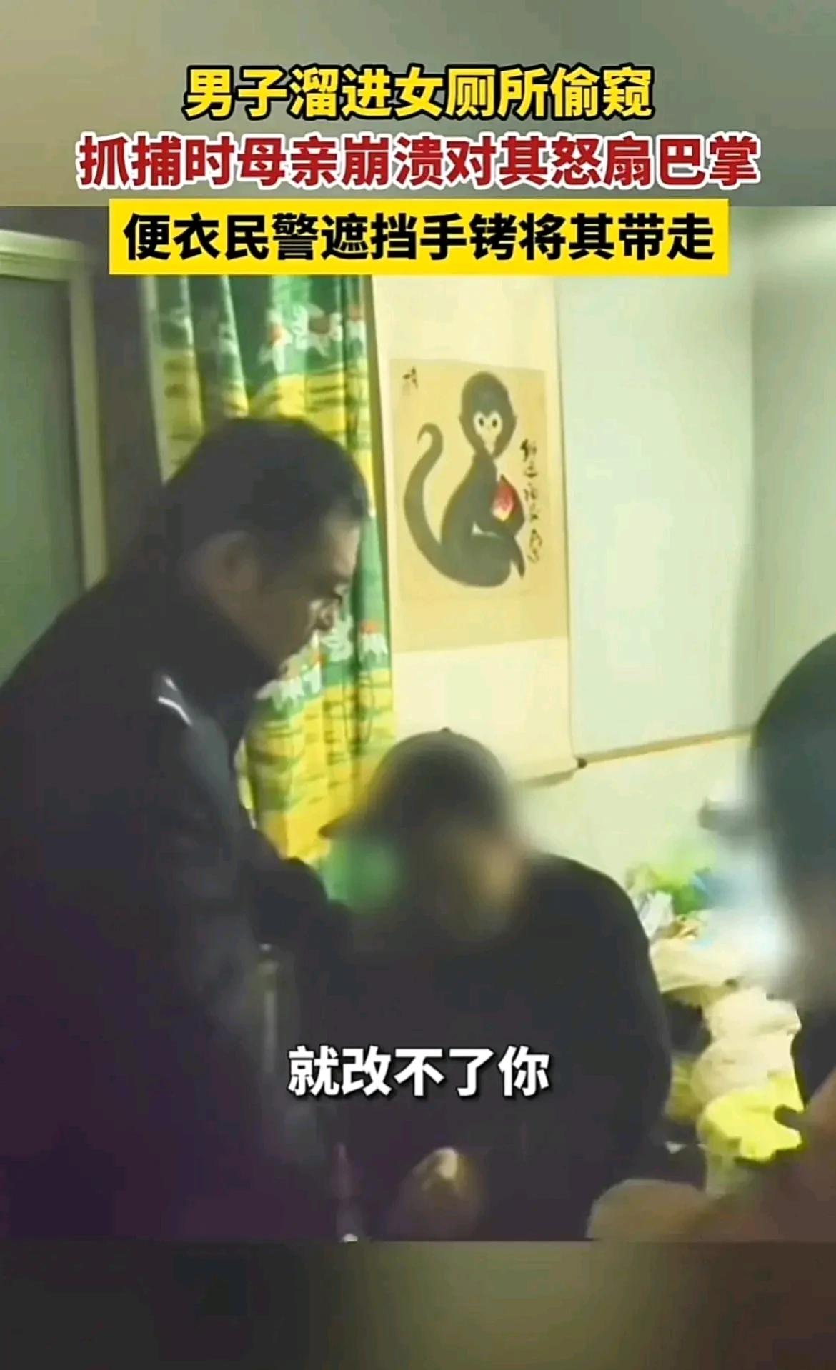 男子进女厕所偷窥被抓,母亲崩溃怒扇儿子巴掌,便衣警察顾及男子的脸面,遮挡着手铐将男子带走。看着这怒气冲冲的母亲,狠狠揍儿子耳光的时候,每一个当母亲的都感受到这恨铁不成钢的心情。 看着高高举起手的母亲,令人细思极恐。 每一个孩子都是母亲的宝贝,这个母亲为什么如此痛哭流涕的痛下巴掌揍自己的孩子? 原因,这男子再一再二再三的犯错误。 他一次又一次的犯错误,让这老母亲都要气疯了。 这男子就喜欢溜进女厕所偷窥女子上厕所。 这可是犯法行为。 从他母亲的言语辱骂中,得知,这不是一次两次的事情。 这男子是经常性干这样的傻事。 母亲打他,也是气他屡教不改,丢人现眼。 这么个大小伙子啦,喜欢的爱好,居然是令人难以接受的另类,确实令人难以接受。 难怪这个母亲如此生气和愤怒。 我好像在哪里看见过这样的事情,好像这是一种心理疾病,得治。 网友说:赶紧给他这个媳妇。 但有的网友说:和有没有媳妇没关系。 他也知道错了,也知道给警察叔叔下跪说:警察叔叔,我错了。 一个警察叔叔,就知道他还是一个孩子,看样子也就是初中生或者高中生。 可怜的孩子,愿他早日走出疾病的困扰,好好做人。 如果改正不了这个毛病,会毁了孩子一生。