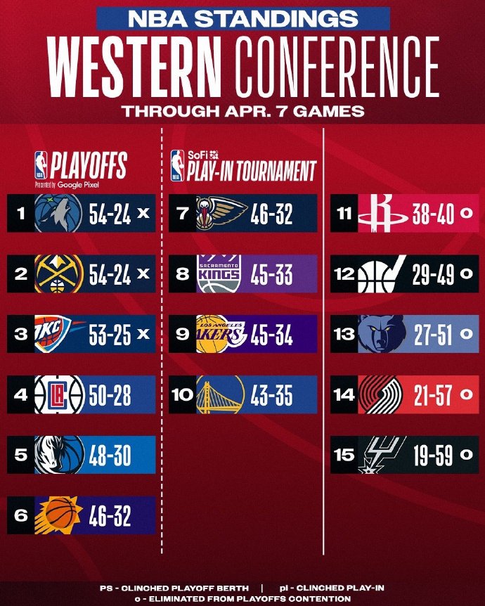 只要湖人全胜,太阳再输一场,湖人必第六脱离附加赛。湖人加油吧。