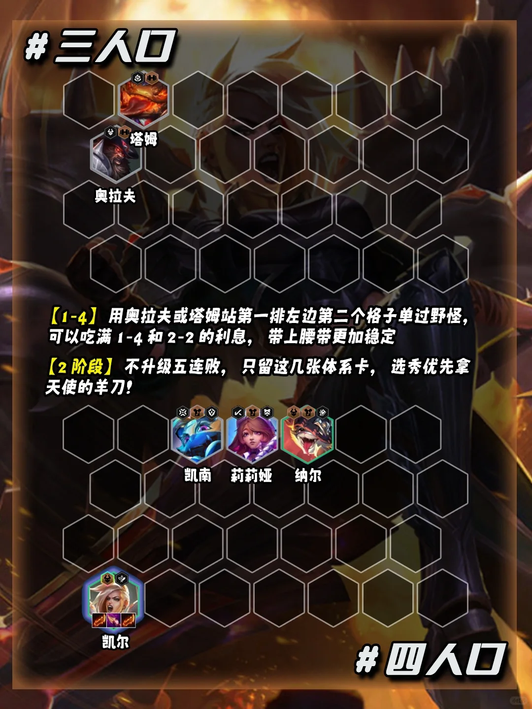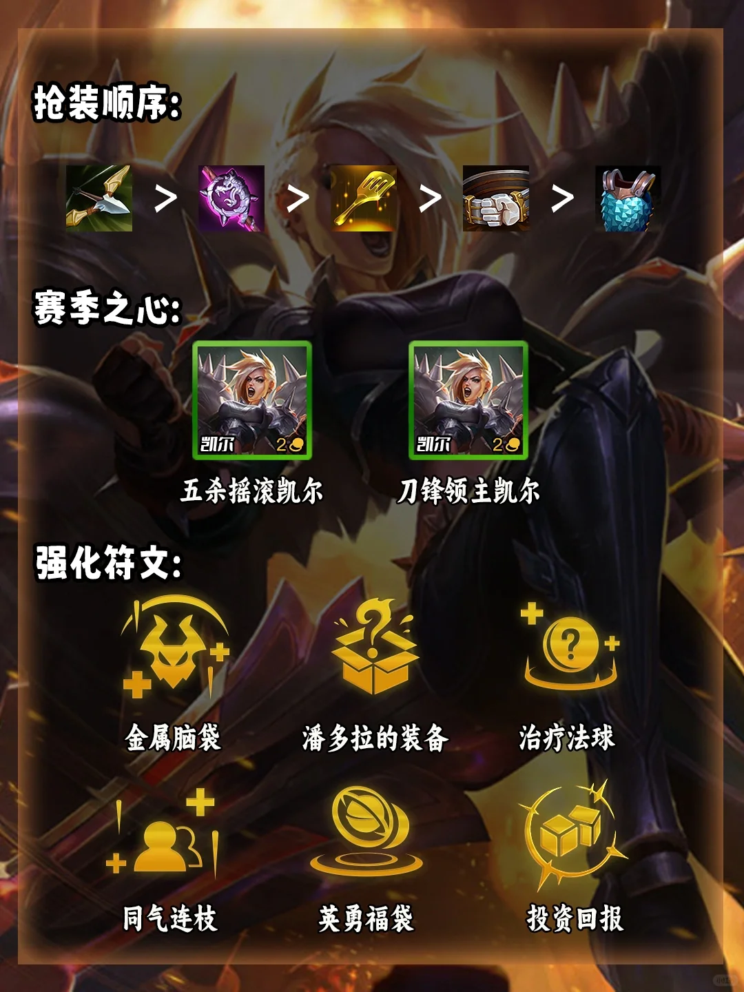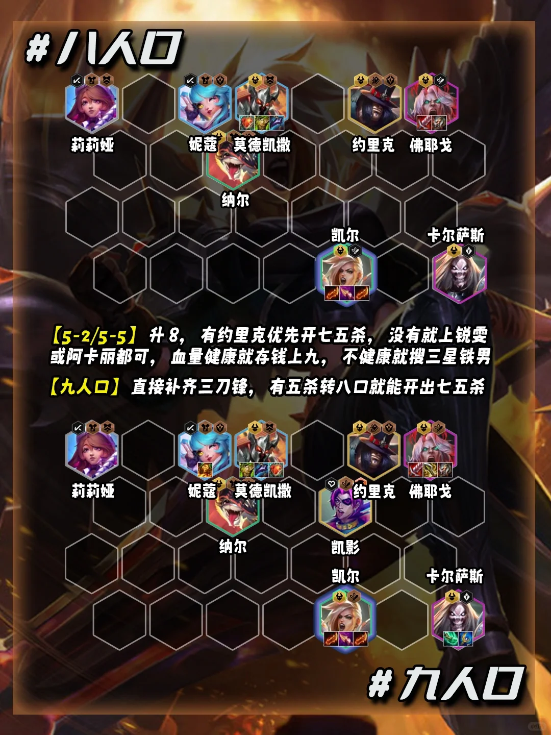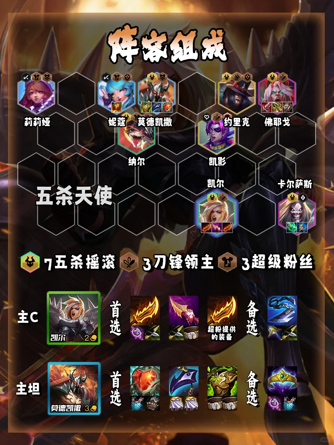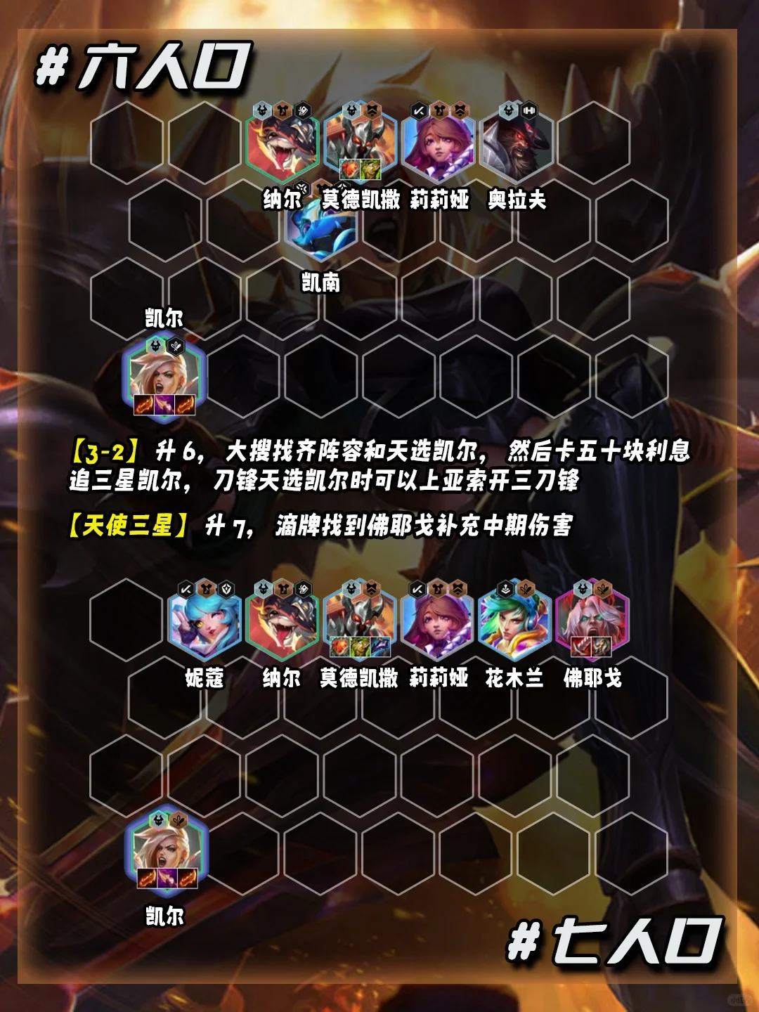 🍖版本更新凯尔巨大加强! 🍗搭配上佛耶戈的巨大加强,简直无敌! ✨运营思路✨ 【2阶段】连败抢弓箭和法棒,保证经济最大化 【3-2】升6级,大搜找到天选凯尔和全员两星即可存钱,卡着三十利息追三星凯尔 【凯尔三星】升7级,补充羁绊即可 【八人口】大搜找到全员两星即可存钱上九 【九人口】补上凯影开三刀锋