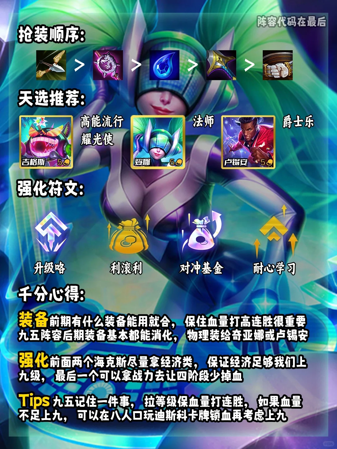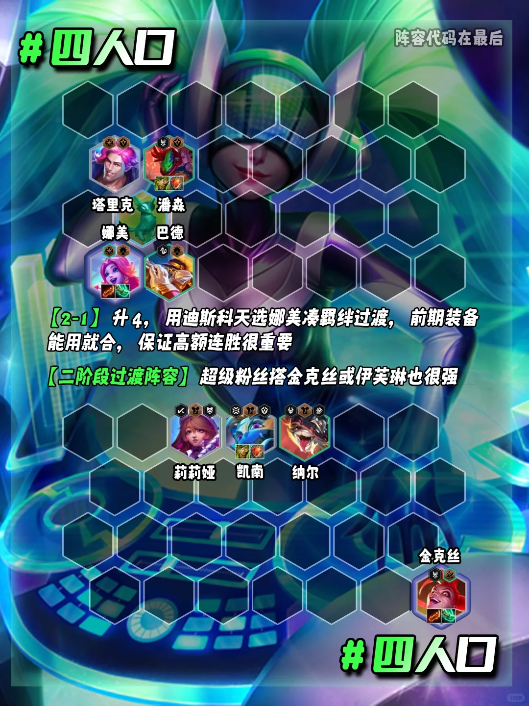 【2-1】升4级,前期用迪斯科天选娜美凑羁绊或超级粉丝搭配kda天选伊芙琳过度,装备能用就合打连胜!