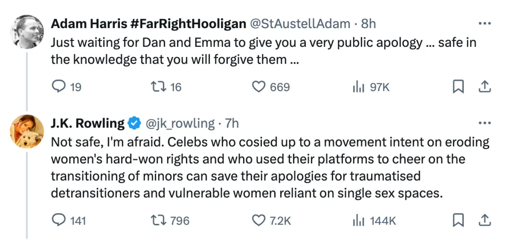 一位网友给J.K.罗琳留言,提到因为公开支持跨性别群体而与罗琳决裂的两位《哈利·波特》明星丹尼尔·雷德克里夫和艾玛·沃森。