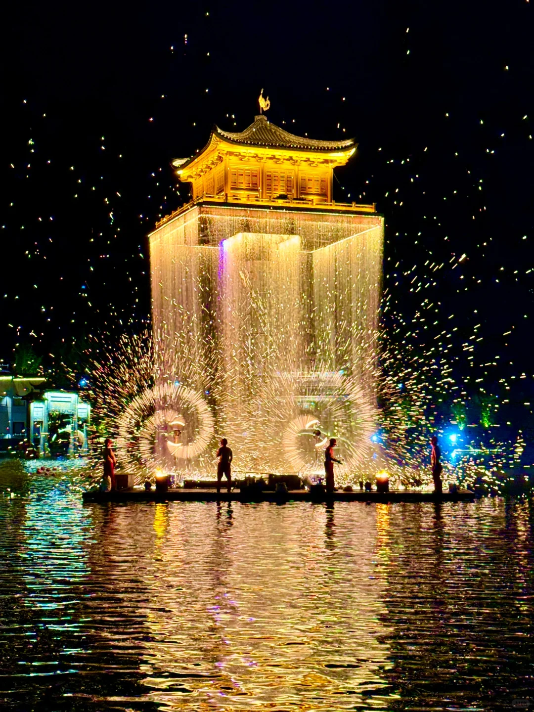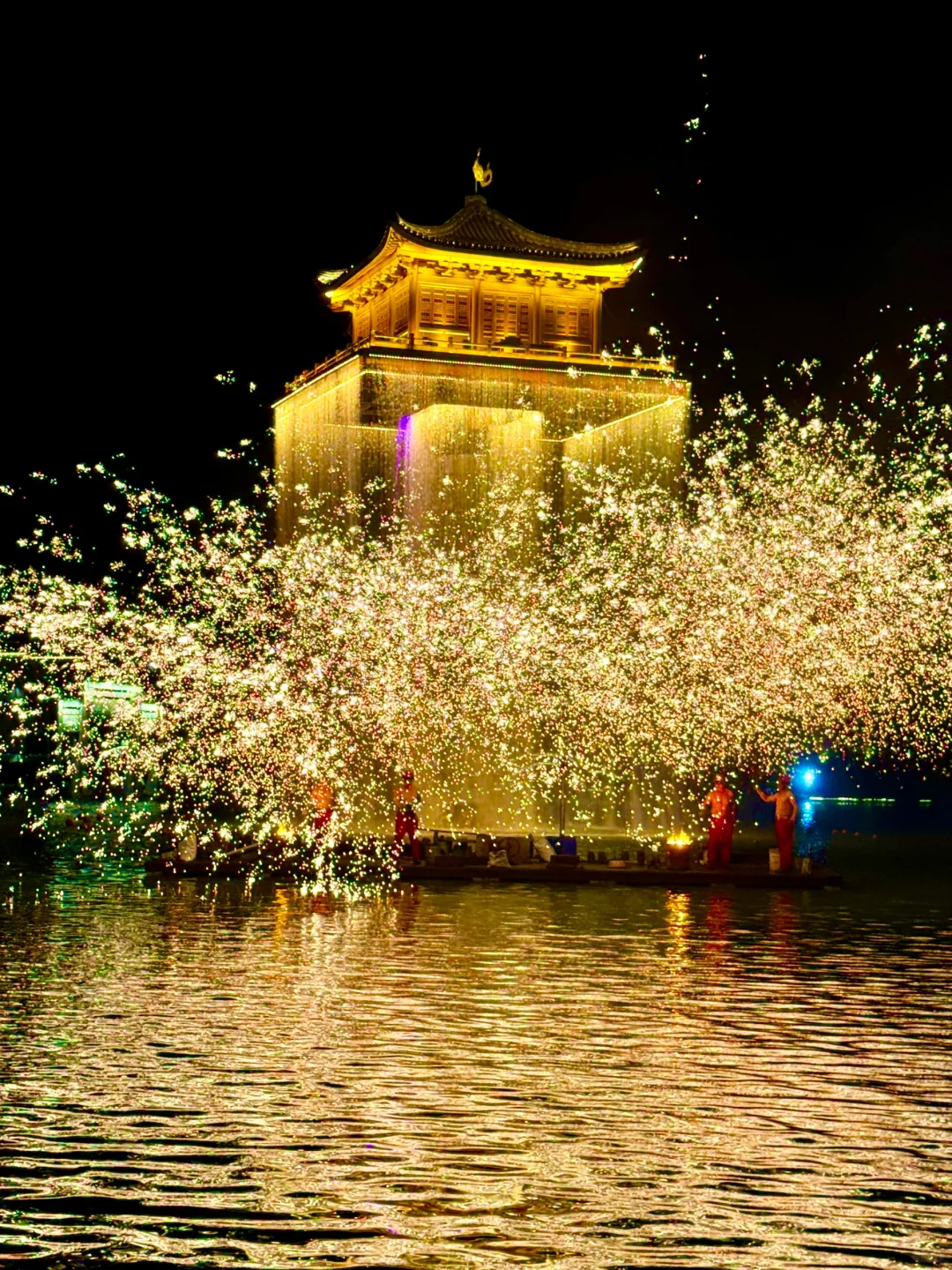 看水上铁花四溅而起,飒沓如流星,让人感受“东风夜放花千树,更吹落,星如雨”的震撼~