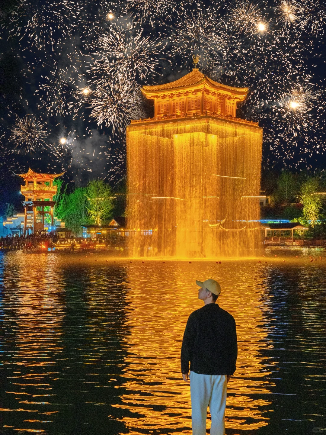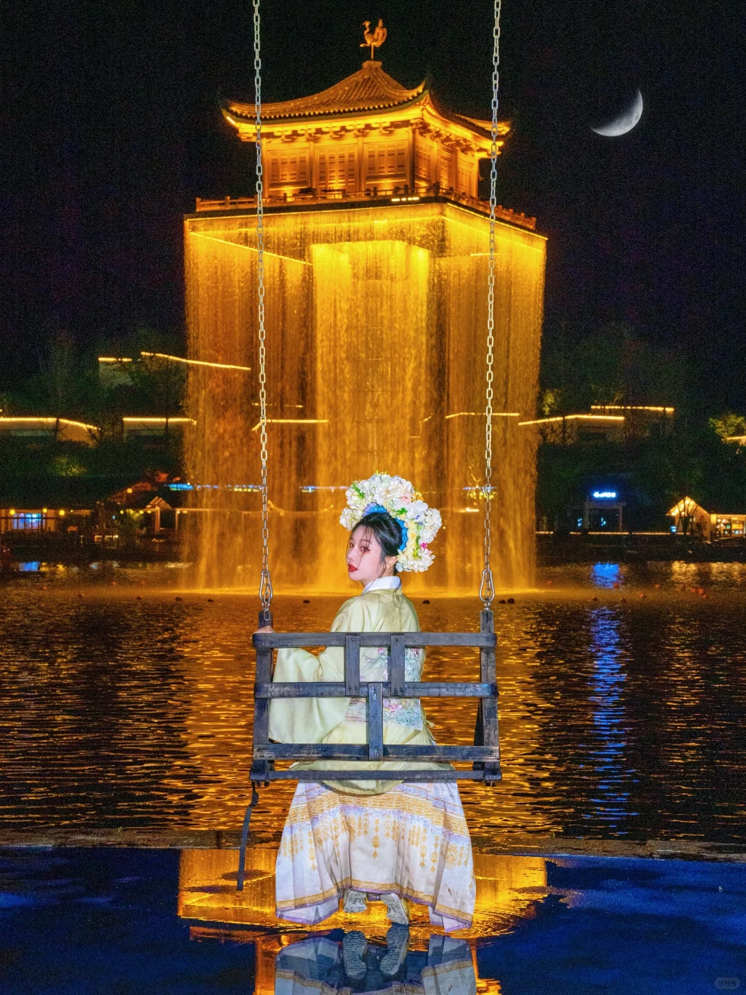 来这也别错过烟花秀!空中金阁烟花四起,坐着秋千or划着摇橹船,感觉一秒穿越回大唐盛世~每个节假日也都有~