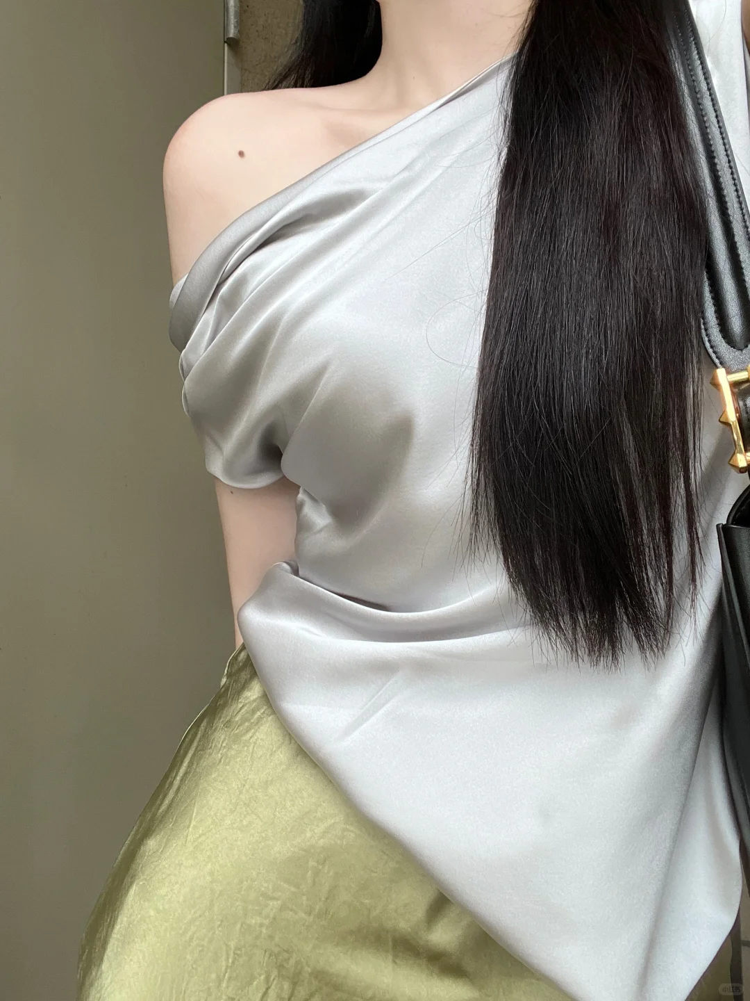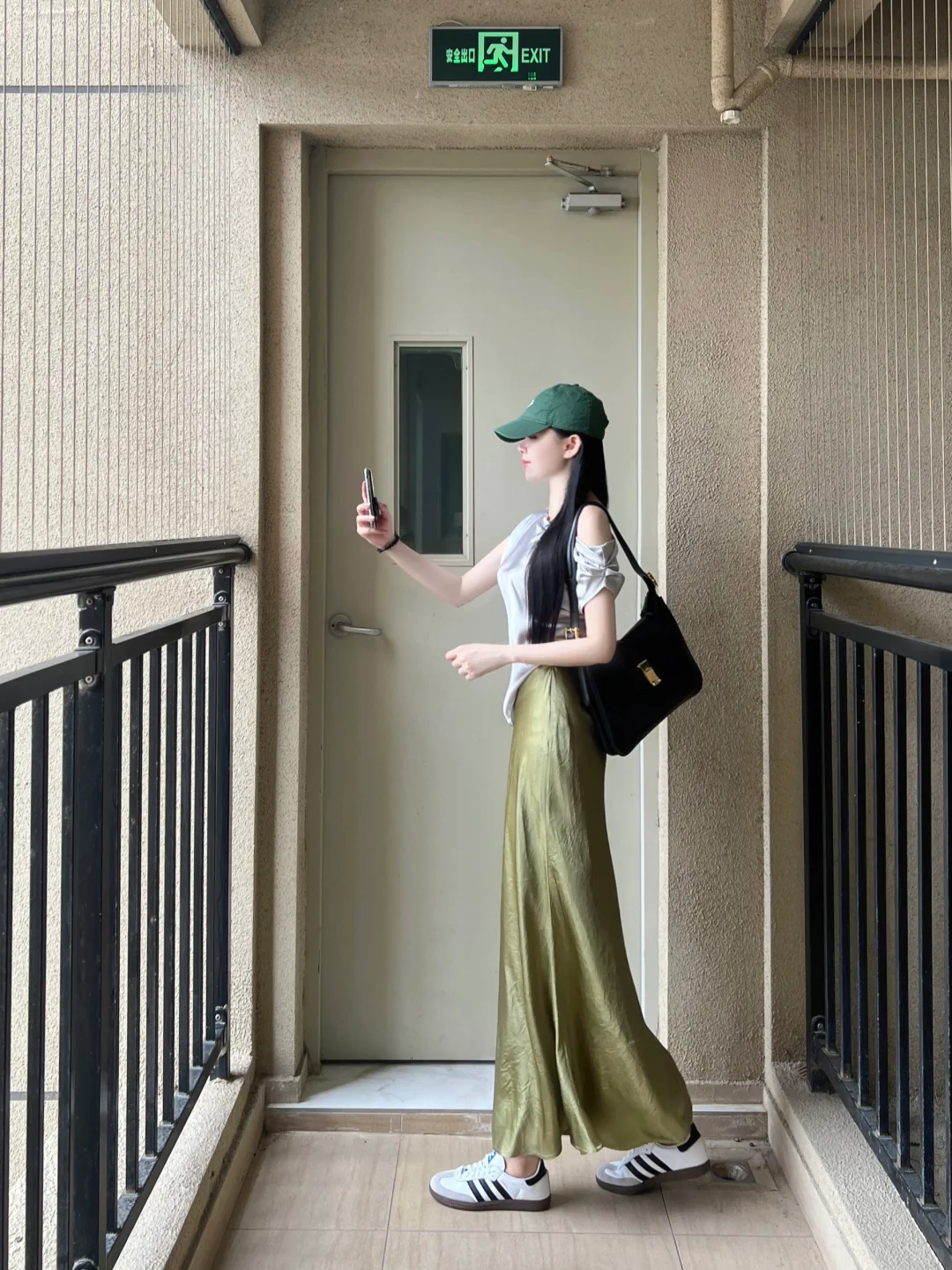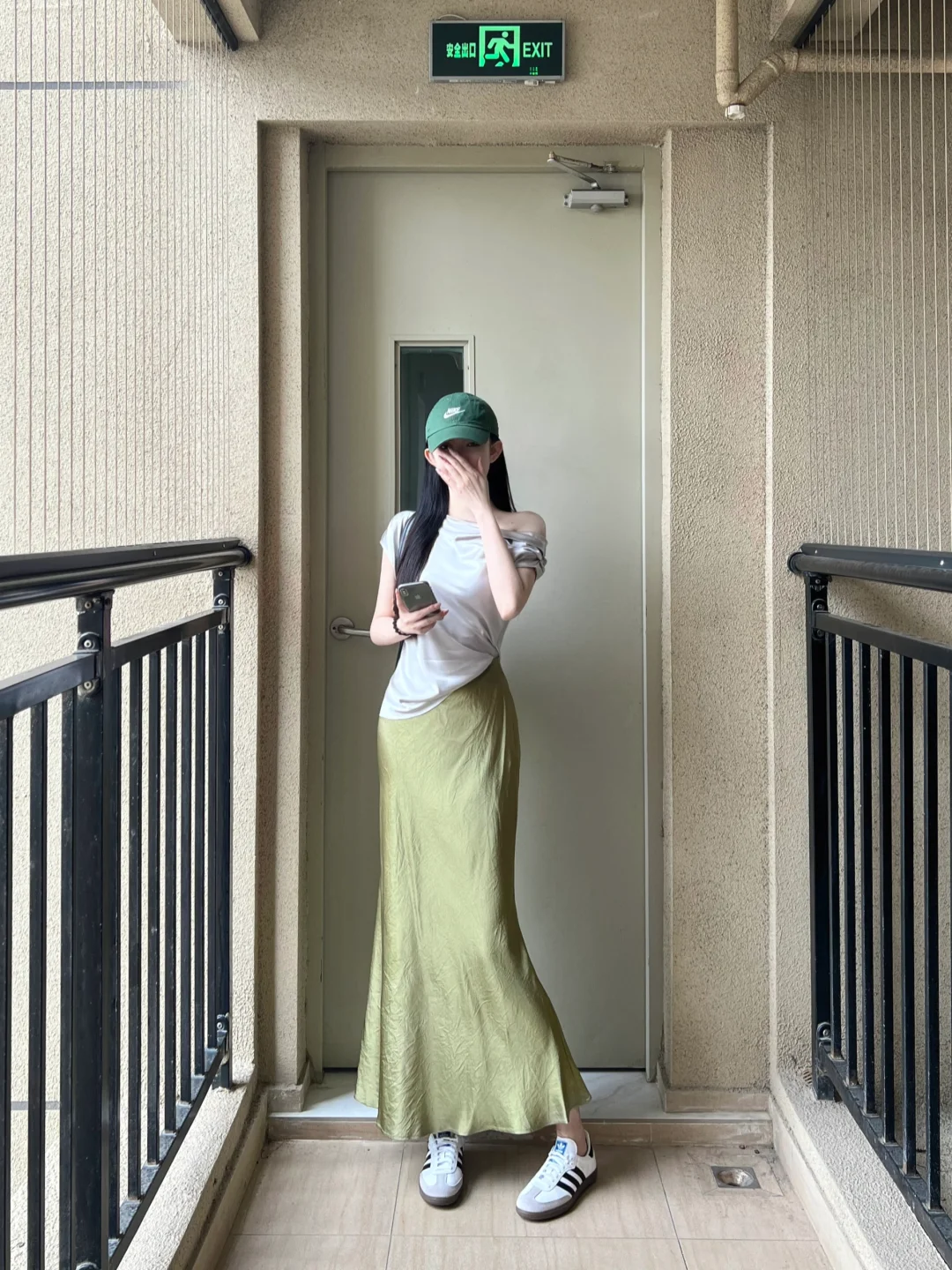 显白穿搭 今天穿什么 夏天 缎面裙 绿色穿搭 气质穿搭